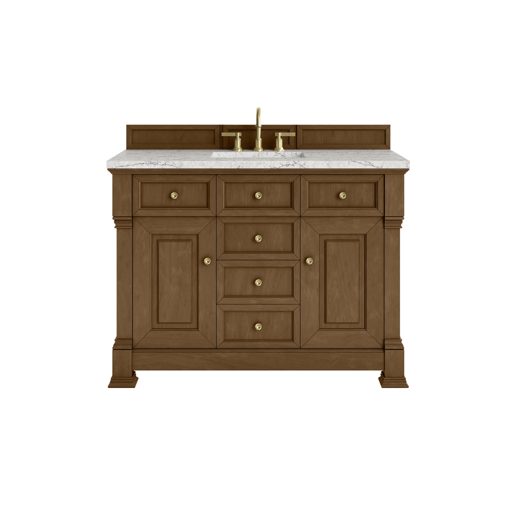 The Brookfield 48" Single Vanity in Honey Oak by James Martin Vanities offers a blend of traditional elegance and contemporary sophistication. The raised panel picture frame doors and detailed corner molding reflect timeless craftsmanship, while the warm Honey Oak vanity finish and Champagne Brass hardware lend a fresh, modern appeal. This beautifully crafted piece features two single-door cabinets that open to interior shelves, three standard drawers and one double height drawer for ample storage. The warm wood tones highlight the natural Oak wood grains, lending sophistication and charm to your space. The addition of an Eternal Jasmine Pearl Silestone® top with undermount sink completes the look.