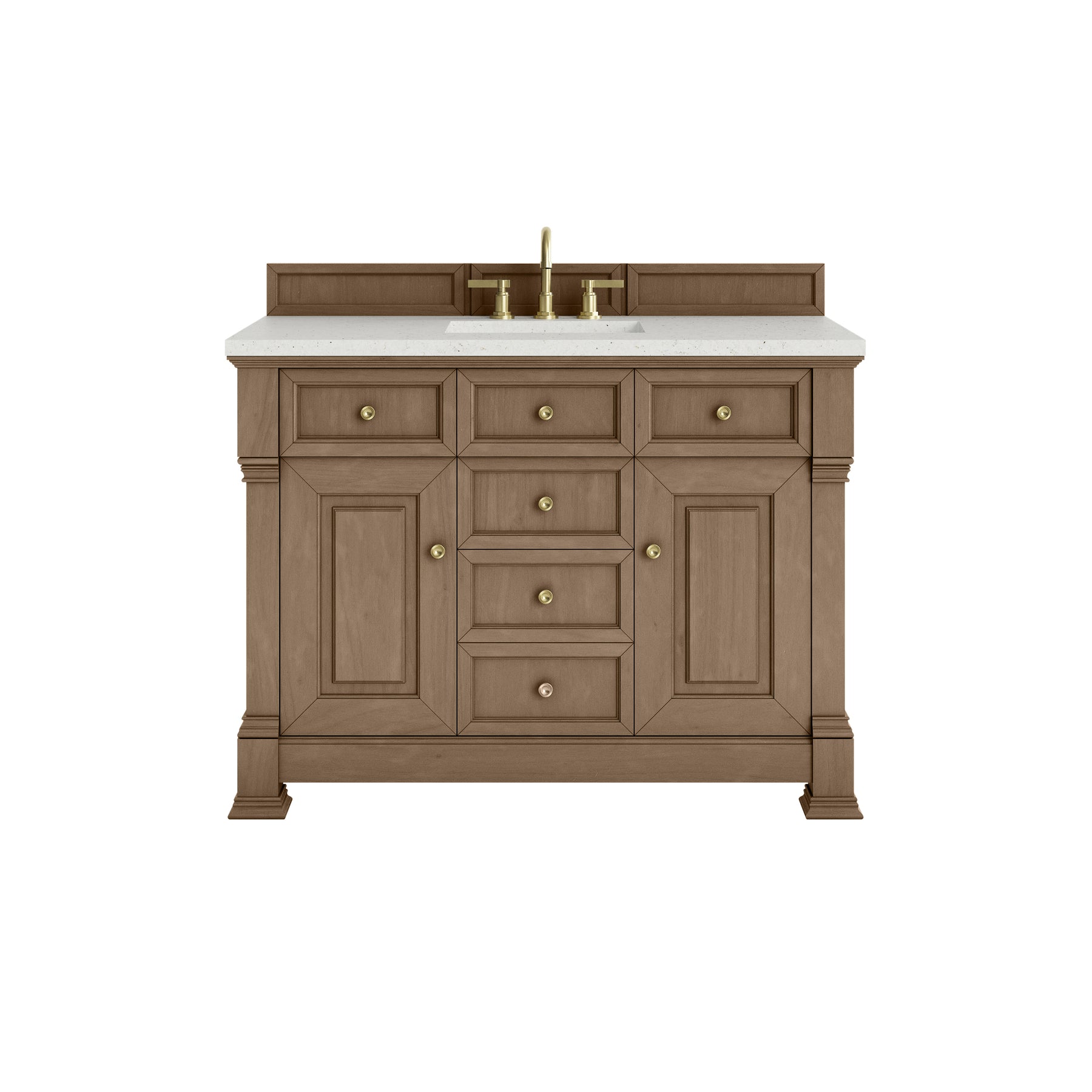 The Brookfield 48" Single Vanity in Pecan by James Martin Vanities offers a blend of traditional elegance and contemporary sophistication. The raised panel picture frame doors and detailed corner molding reflect timeless craftsmanship, while the Pecan vanity finish and Champagne Brass hardware lend a fresh, modern appeal. This beautifully crafted piece features two single-door cabinets that open to interior shelves, three standard drawers and one double height drawer for ample storage. The cool wood tones highlight the natural Oak wood grains, lending sophistication and charm to your space. The addition of a suede-finished Lime Delight Silestone® top with undermount sink completes the look.