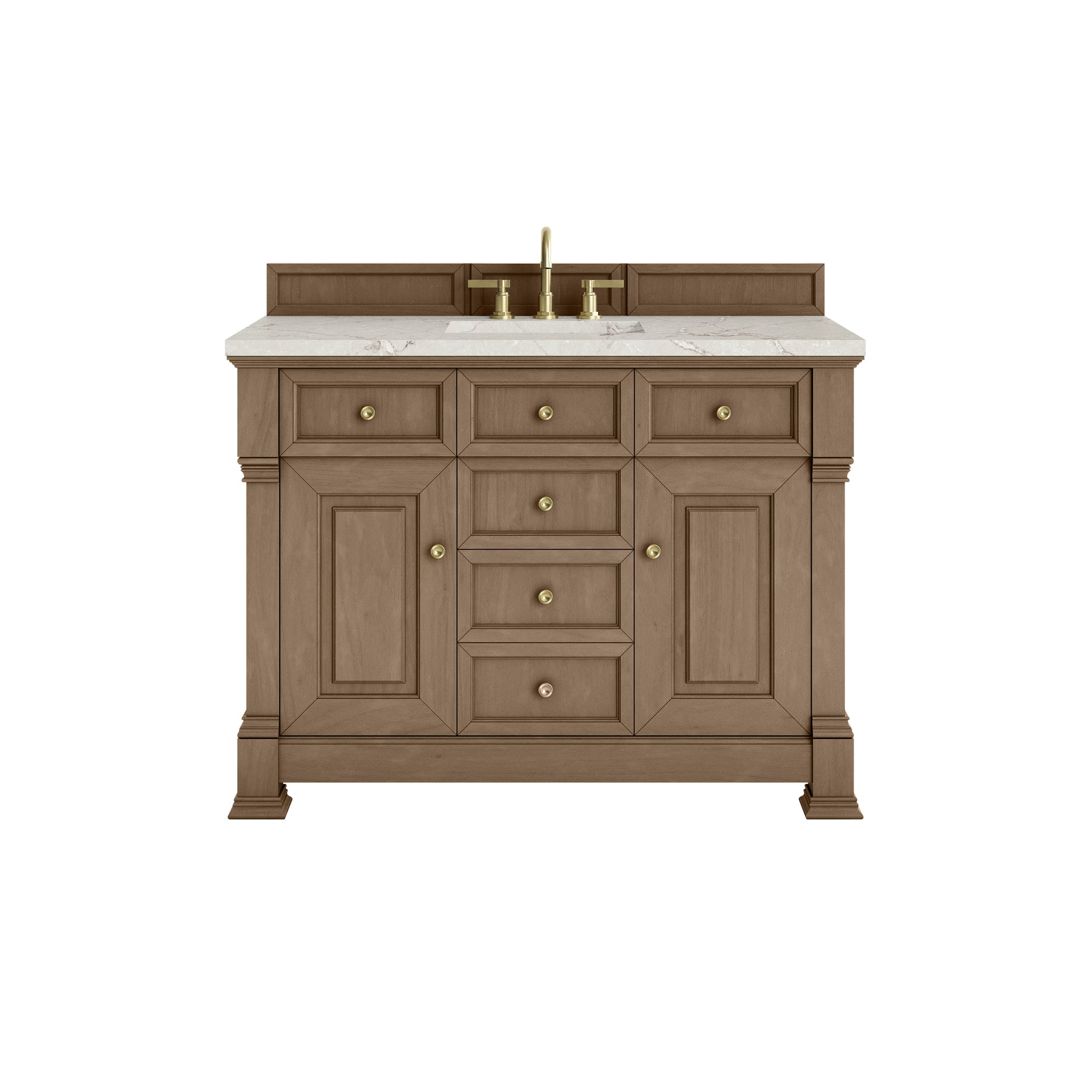 The Brookfield 48" Single Vanity in Pecan by James Martin Vanities offers a blend of traditional elegance and contemporary sophistication. The raised panel picture frame doors and detailed corner molding reflect timeless craftsmanship, while the Pecan vanity finish and Champagne Brass hardware lend a fresh, modern appeal. This beautifully crafted piece features two single-door cabinets that open to interior shelves, three standard drawers and one double height drawer for ample storage. The cool wood tones highlight the natural Oak wood grains, lending sophistication and charm to your space. The addition of a Victorian Silver Silestone® top featuring a neutral white and gray background with fine silver veining, along with an undermount sink, completes the look.