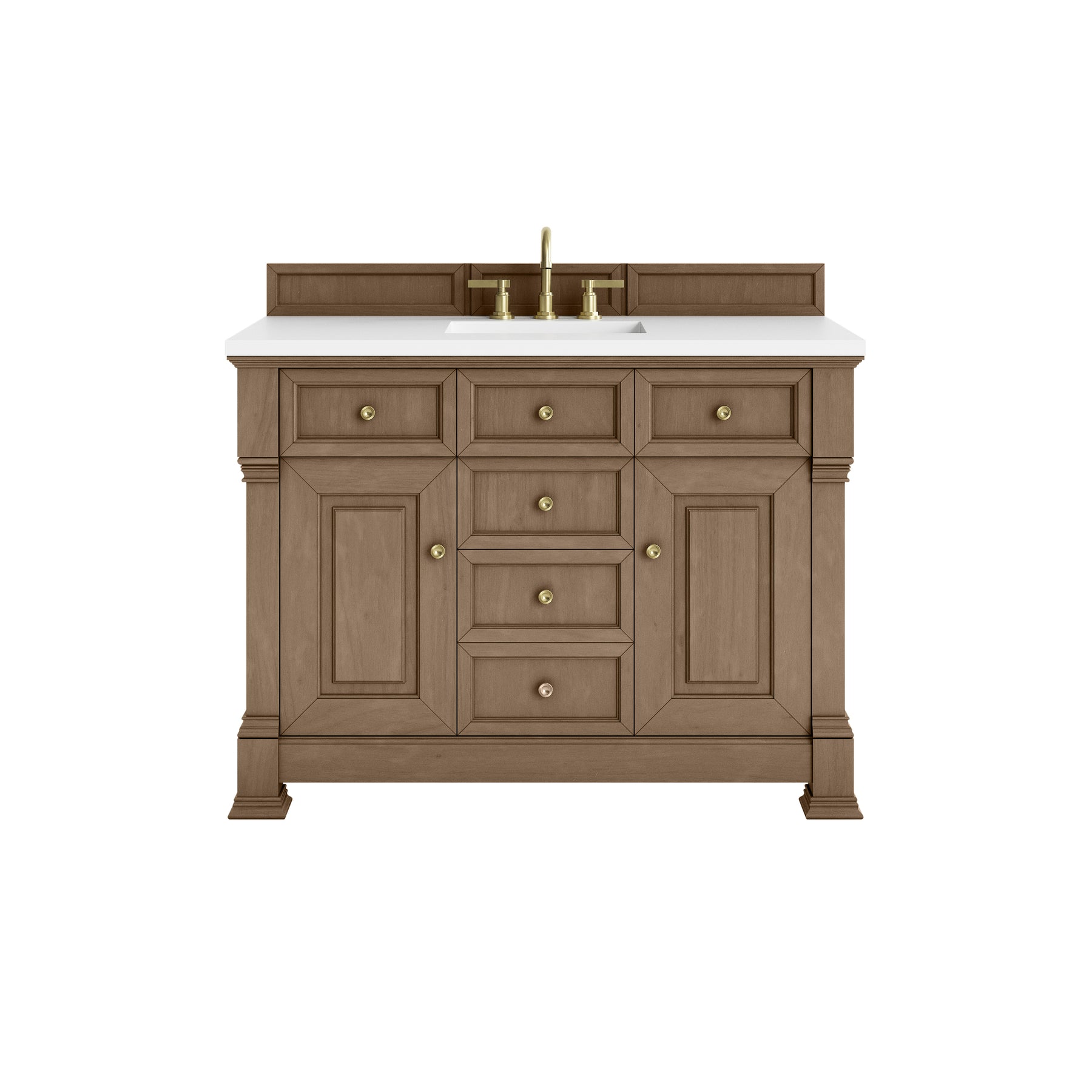 The Brookfield 48" Single Vanity in Pecan by James Martin Vanities offers a blend of traditional elegance and contemporary sophistication. The raised panel picture frame doors and detailed corner molding reflect timeless craftsmanship, while the Pecan vanity finish and Champagne Brass hardware lend a fresh, modern appeal. This beautifully crafted piece features two single-door cabinets that open to interior shelves, three standard drawers and one double height drawer for ample storage. The cool wood tones highlight the natural Oak wood grains, lending sophistication and charm to your space. A classic White Zeus Silestone® top with undermount sink completes the look.