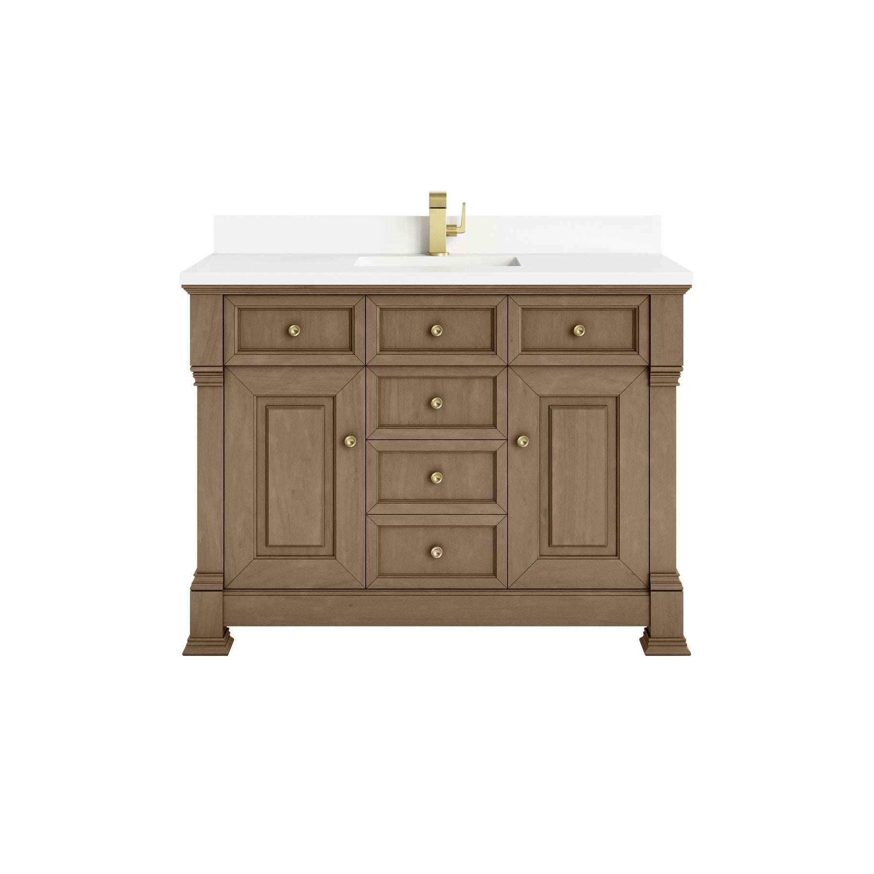 The Brookfield 48" Single Vanity in Pecan by James Martin Vanities offers a blend of traditional elegance and contemporary sophistication. The raised panel picture frame doors and detailed corner molding reflect timeless craftsmanship, while the Pecan vanity finish and Champagne Brass hardware lend a fresh, modern appeal. This beautifully crafted piece features two single-door cabinets that open to interior shelves, three standard drawers and one double height drawer for ample storage. The cool wood tones highlight the natural Oak wood grains, lending sophistication and charm to your space. The vanity is completed by a classic White Zeus SilestoneĀ® top and backsplash with undermount sink.