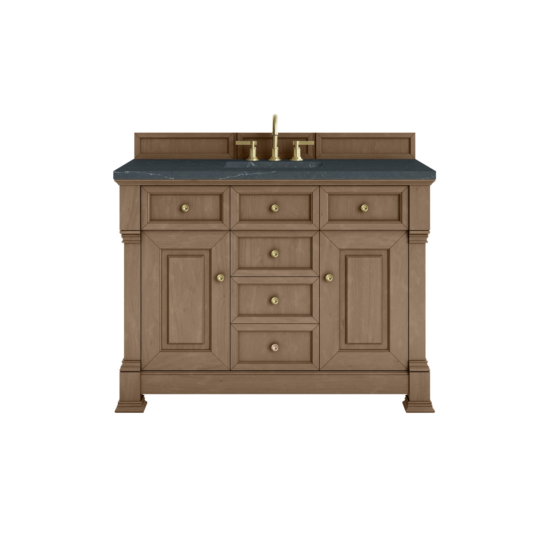 The Brookfield 48" Single Vanity in Pecan by James Martin Vanities offers a blend of traditional elegance and contemporary sophistication. The raised panel picture frame doors and detailed corner molding reflect timeless craftsmanship, while the Pecan vanity finish and Champagne Brass hardware lend a fresh, modern appeal. This beautifully crafted piece features two single-door cabinets that open to interior shelves, three standard drawers and one double height drawer for ample storage. The cool wood tones highlight the natural Oak wood grains, lending sophistication and charm to your space. The addition of a matte Charcoal Soapstone SilestoneĀ® top with undermount sink completes the look.