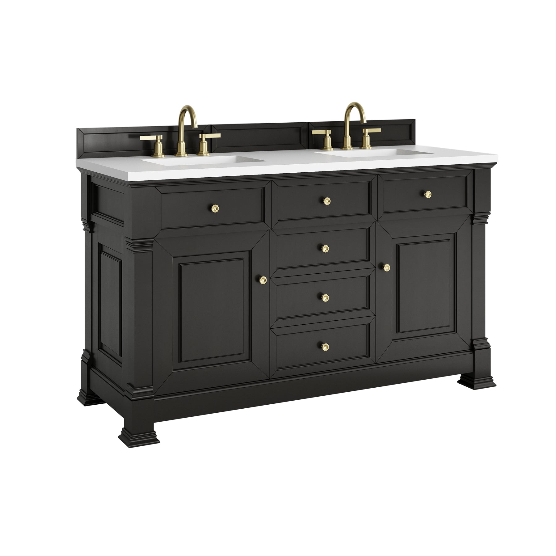 The Brookfield 60" Double Vanity in Black Onyx by James Martin Vanities offers a blend of traditional elegance and contemporary sophistication. The raised panel picture frame doors and detailed corner molding reflect timeless craftsmanship, while the rich Black Onyx finish and Champagne Brass hardware lend a fresh, modern appeal. This beautifully crafted vanity features two single door cabinets that open to interior shelves, along with four standard drawers for ample storage. The timeless Black Onyx finish lends sophistication and charm to your space. A classic White Zeus SilestoneĀ® top with undermount sinks completes the look.