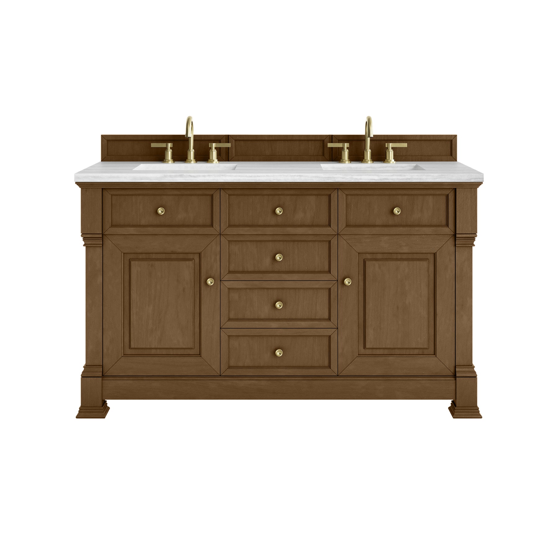 The Brookfield 60" Double Vanity in Honey Oak by James Martin Vanities offers a blend of traditional elegance and contemporary sophistication. The raised panel picture frame doors and detailed corner molding reflect timeless craftsmanship, while the warm Honey Oak finish and Champagne Brass hardware lend a fresh, modern appeal. This beautifully crafted vanity features two single door cabinets that open to interior shelves, along with four standard drawers for ample storage. The warm wood tones highlight the natural Oak wood grains, lending sophistication and charm to your space. The addition of an Arctic Fall Solid Surface top with white porcelain undermount sinks completes the look.