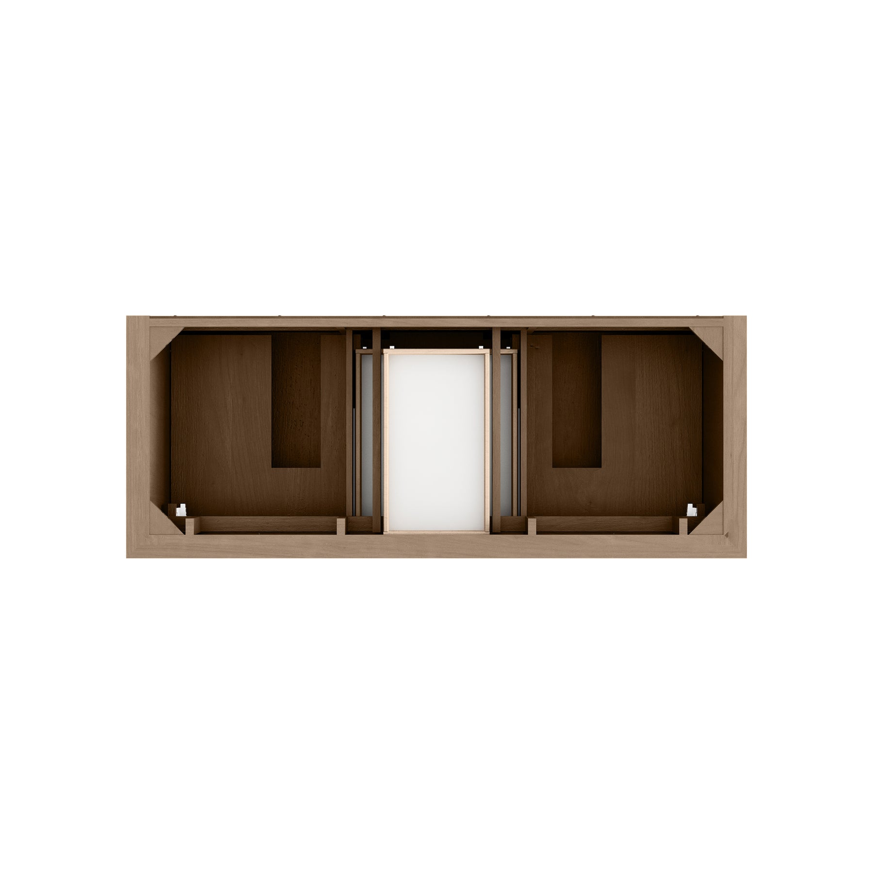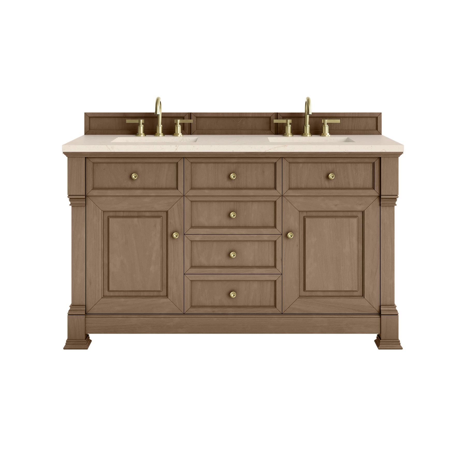 The Brookfield 60" Double Vanity in Pecan by James Martin Vanities offers a blend of traditional elegance and contemporary sophistication. The raised panel picture frame doors and detailed corner molding reflect timeless craftsmanship, while the Pecan finish and Champagne Brass hardware lend a fresh, modern appeal. This beautifully crafted vanity features two single door cabinets that open to interior shelves, along with four standard drawers for ample storage. The cool wood tones highlight the natural Oak wood grains, lending sophistication and charm to your space. The addition of an Eternal Marfil Silestone® top with undermount sinks completes the look.