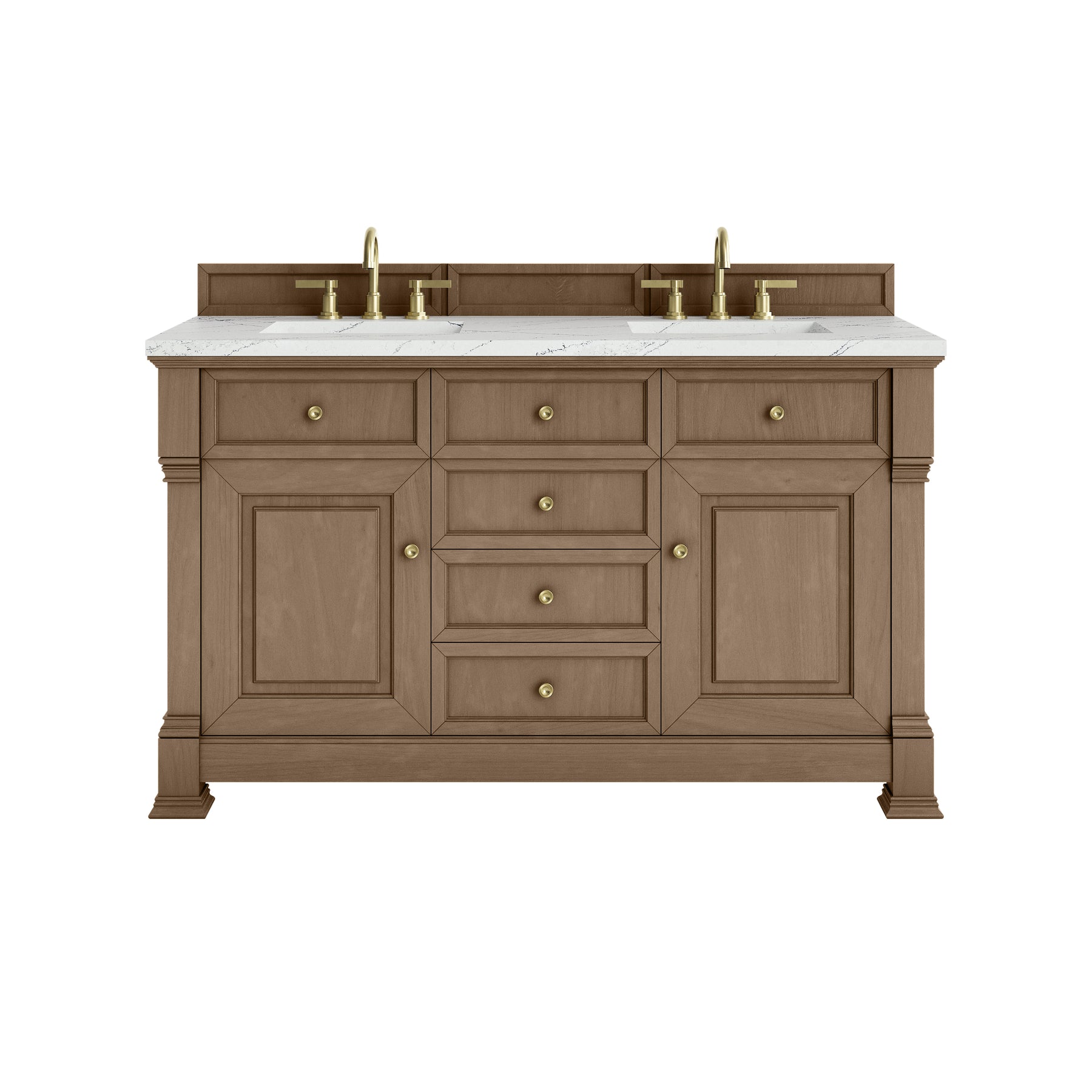 The Brookfield 60" Double Vanity in Pecan by James Martin Vanities offers a blend of traditional elegance and contemporary sophistication. The raised panel picture frame doors and detailed corner molding reflect timeless craftsmanship, while the Pecan finish and Champagne Brass hardware lend a fresh, modern appeal. This beautifully crafted vanity features two single door cabinets that open to interior shelves, along with four standard drawers for ample storage. The cool wood tones highlight the natural Oak wood grains, lending sophistication and charm to your space. The addition of an Ethereal Noctis Silestone® top with undermount sinks completes the look.