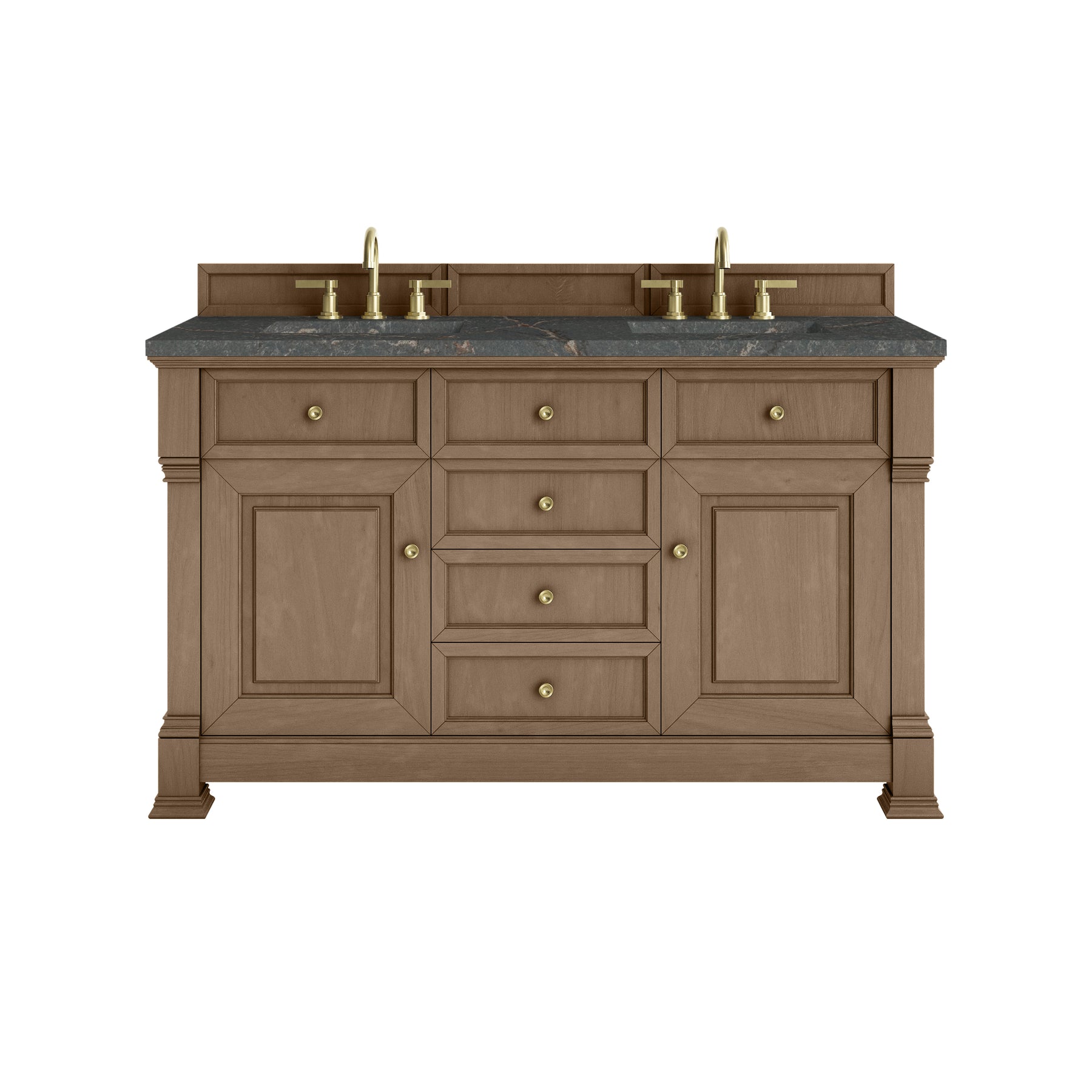 The Brookfield 60" Double Vanity in Pecan by James Martin Vanities offers a blend of traditional elegance and contemporary sophistication. The raised panel picture frame doors and detailed corner molding reflect timeless craftsmanship, while the Pecan finish and Champagne Brass hardware lend a fresh, modern appeal. This beautifully crafted vanity features two single door cabinets that open to interior shelves, along with four standard drawers for ample storage. The cool wood tones highlight the natural Oak wood grains, lending sophistication and charm to your space. The addition of a Parisien Bleu Silestone® top featuring copper veining and an undermount sinks completes the look.