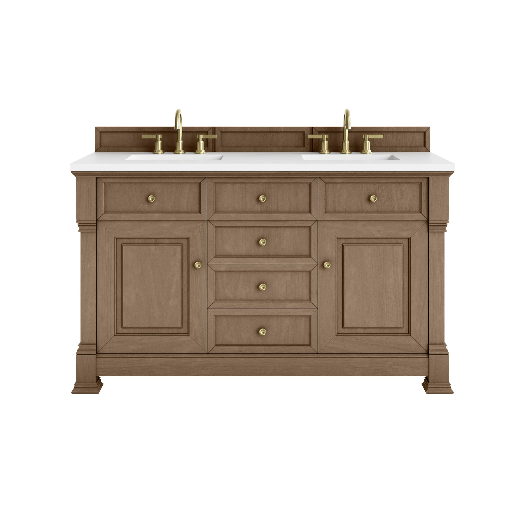 The Brookfield 60" Double Vanity in Pecan by James Martin Vanities offers a blend of traditional elegance and contemporary sophistication. The raised panel picture frame doors and detailed corner molding reflect timeless craftsmanship, while the Pecan finish and Champagne Brass hardware lend a fresh, modern appeal. This beautifully crafted vanity features two single door cabinets that open to interior shelves, along with four standard drawers for ample storage. The cool wood tones highlight the natural Oak wood grains, lending sophistication and charm to your space. A classic White Zeus Silestone® top with undermount sinks completes the look.
