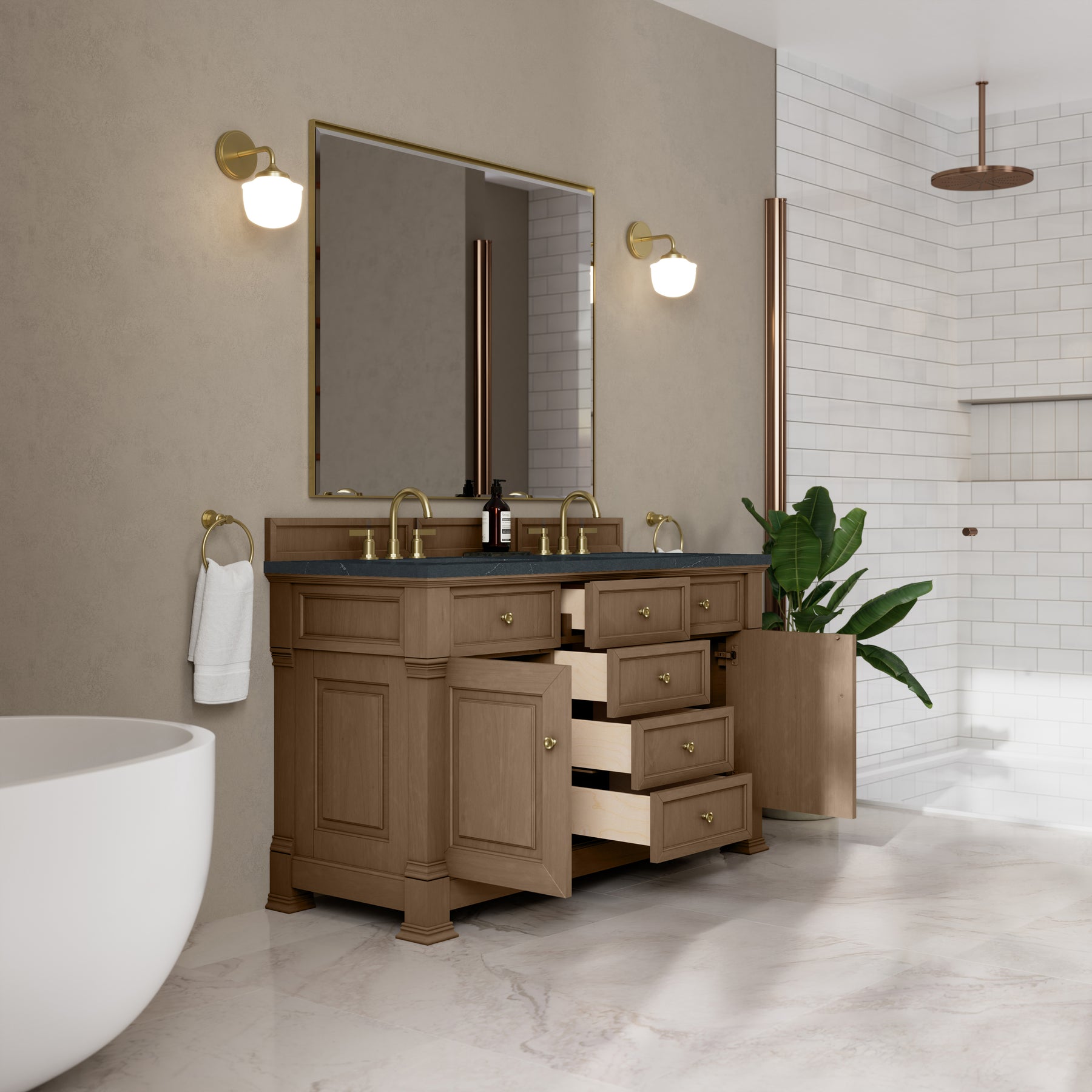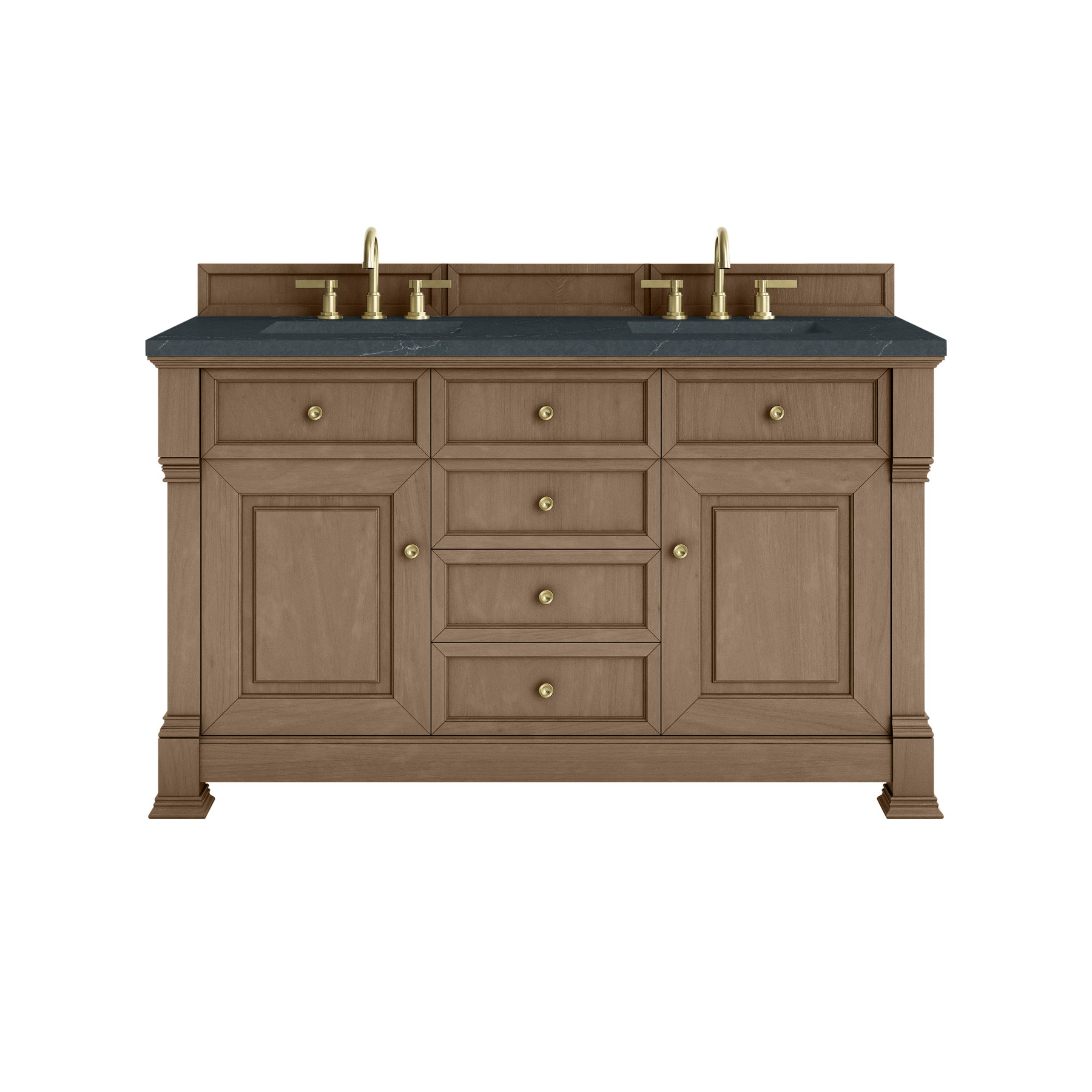 The Brookfield 60" Double Vanity in Pecan by James Martin Vanities offers a blend of traditional elegance and contemporary sophistication. The raised panel picture frame doors and detailed corner molding reflect timeless craftsmanship, while the Pecan finish and Champagne Brass hardware lend a fresh, modern appeal. This beautifully crafted vanity features two single door cabinets that open to interior shelves, along with four standard drawers for ample storage. The cool wood tones highlight the natural Oak wood grains, lending sophistication and charm to your space. The addition of a matte Charcoal Soapstone SilestoneĀ® top with undermount sinks completes the look.