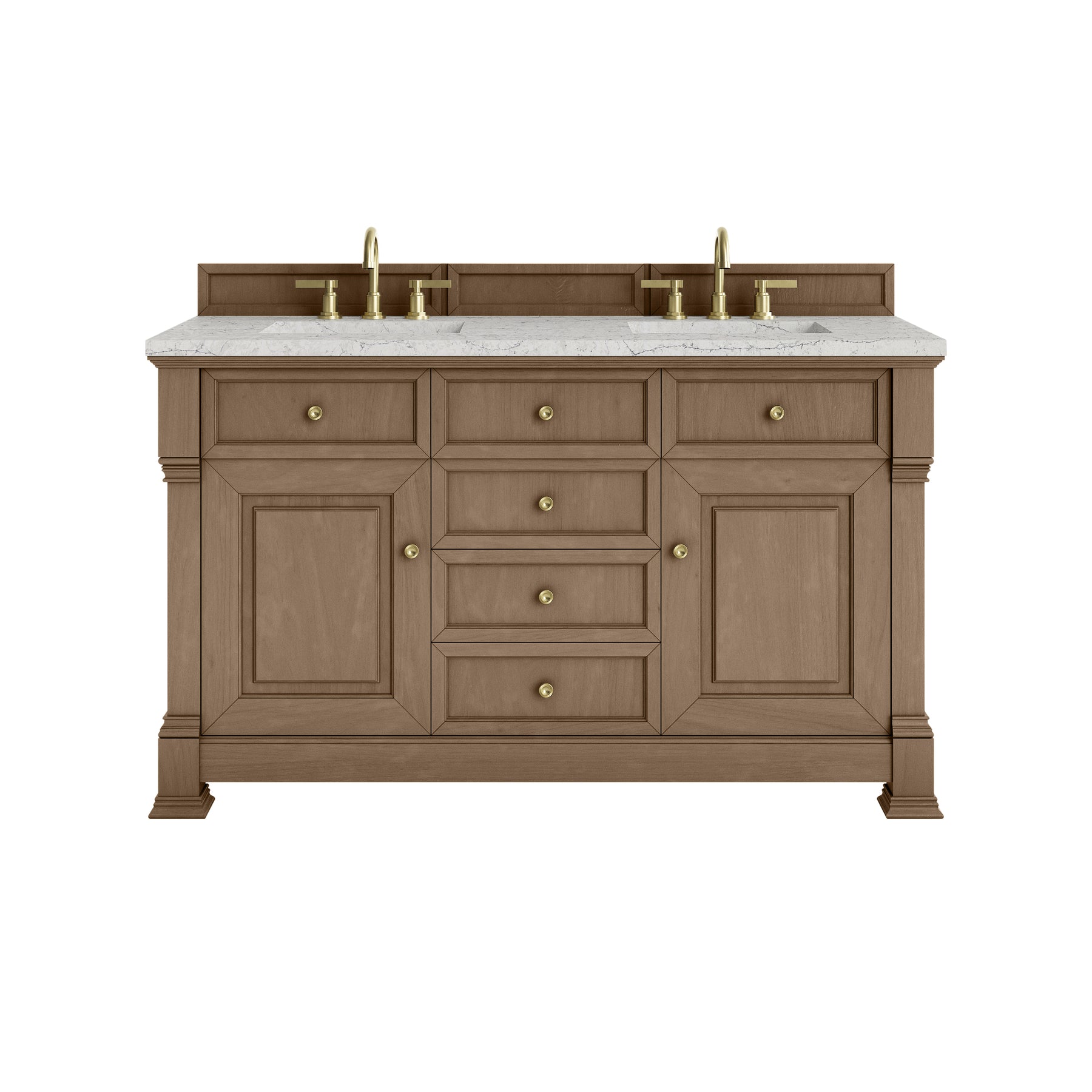The Brookfield 60" Double Vanity in Pecan by James Martin Vanities offers a blend of traditional elegance and contemporary sophistication. The raised panel picture frame doors and detailed corner molding reflect timeless craftsmanship, while the Pecan finish and Champagne Brass hardware lend a fresh, modern appeal. This beautifully crafted vanity features two single door cabinets that open to interior shelves, along with four standard drawers for ample storage. The cool wood tones highlight the natural Oak wood grains, lending sophistication and charm to your space. The addition of an Eternal Jasmine Pearl SilestoneĀ® top with undermount sinks completes the look.