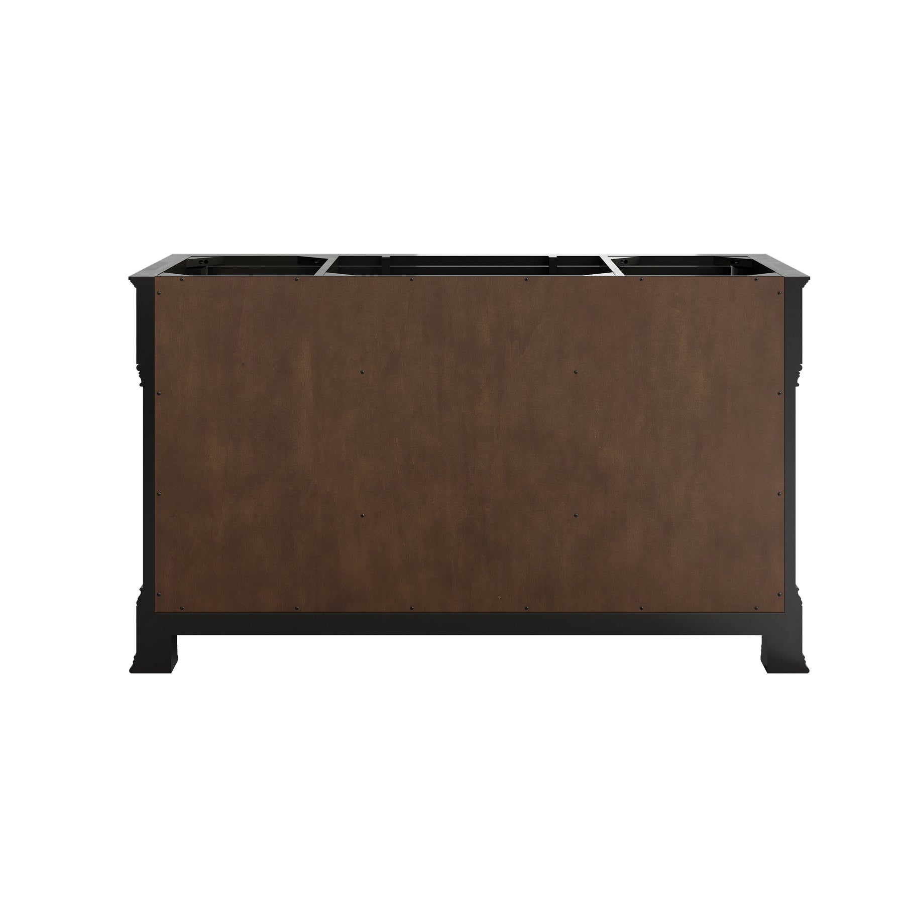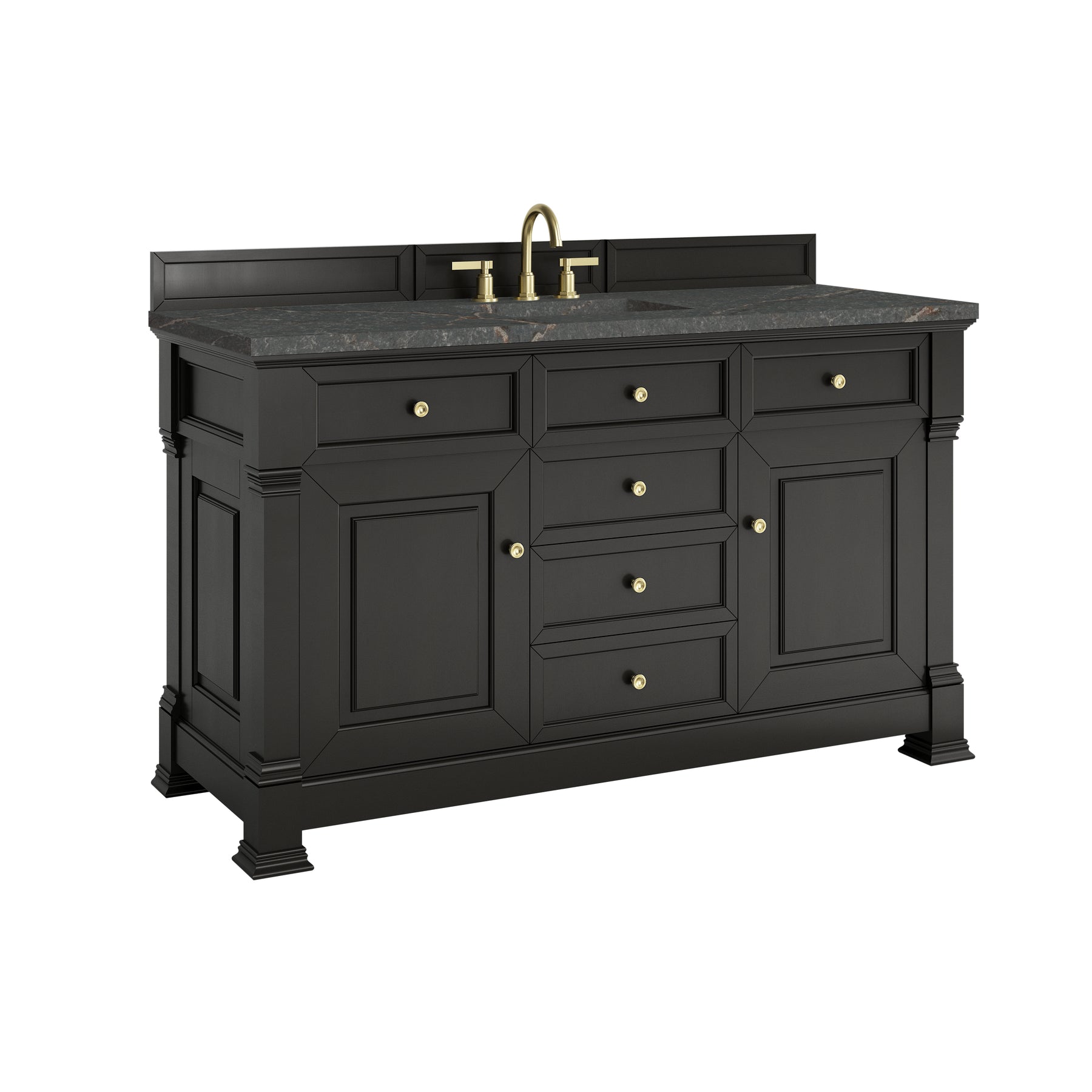 The Brookfield 60" Single Vanity in Black Onyx by James Martin Vanities offers a blend of traditional elegance and contemporary sophistication. The raised panel picture frame doors and detailed corner molding reflect timeless craftsmanship, while the rich Black Onyx finish and Champagne Brass hardware lend a fresh, modern appeal. This beautifully crafted vanity features two single door cabinets that open to interior shelves, along with five standard drawers for ample storage. The timeless Black Onyx finish lends sophistication and charm to your space. The addition of a Parisien Bleu SilestoneĀ® top and undermount sink completes the look.