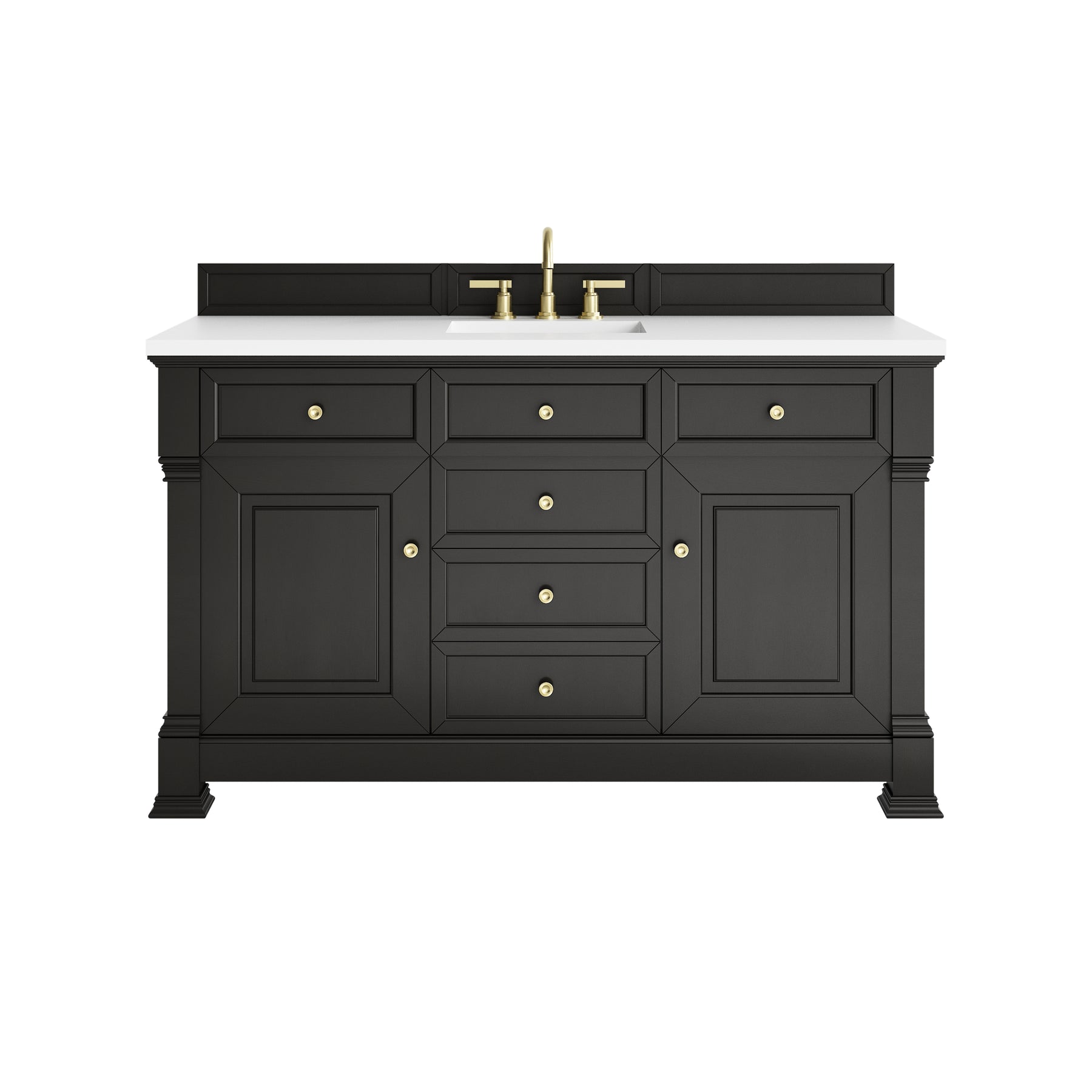 The Brookfield 60" Single Vanity in Black Onyx by James Martin Vanities offers a blend of traditional elegance and contemporary sophistication. The raised panel picture frame doors and detailed corner molding reflect timeless craftsmanship, while the rich Black Onyx finish and Champagne Brass hardware lend a fresh, modern appeal. This beautifully crafted vanity features two single door cabinets that open to interior shelves, along with five standard drawers for ample storage. The timeless Black Onyx finish lends sophistication and charm to your space. A classic White Zeus SilestoneĀ® top with undermount sink completes the look.