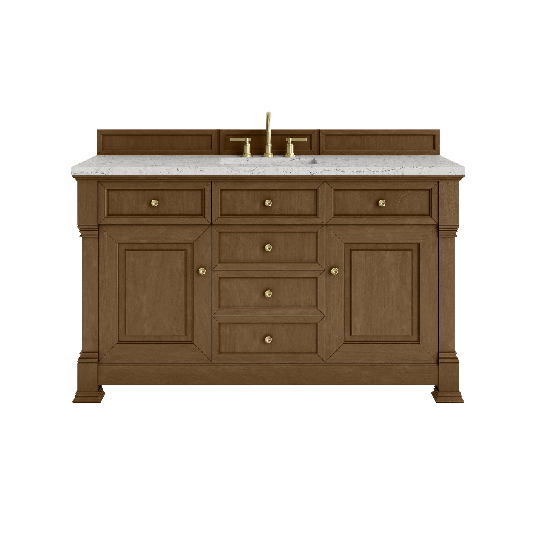 The Brookfield 60" Single Vanity in Honey Oak by James Martin Vanities offers a blend of traditional elegance and contemporary sophistication. The raised panel picture frame doors and detailed corner molding reflect timeless craftsmanship, while the warm Honey Oak finish and Champagne Brass hardware lend a fresh, modern appeal. This beautifully crafted vanity features two single-door cabinets that open to interior shelves, along with five standard drawers for ample storage. The warm wood tones highlight the natural Oak wood grains, lending sophistication and charm to your space. The addition of an Eternal Jasmine Pearl Silestone® top with undermount sink completes the look.