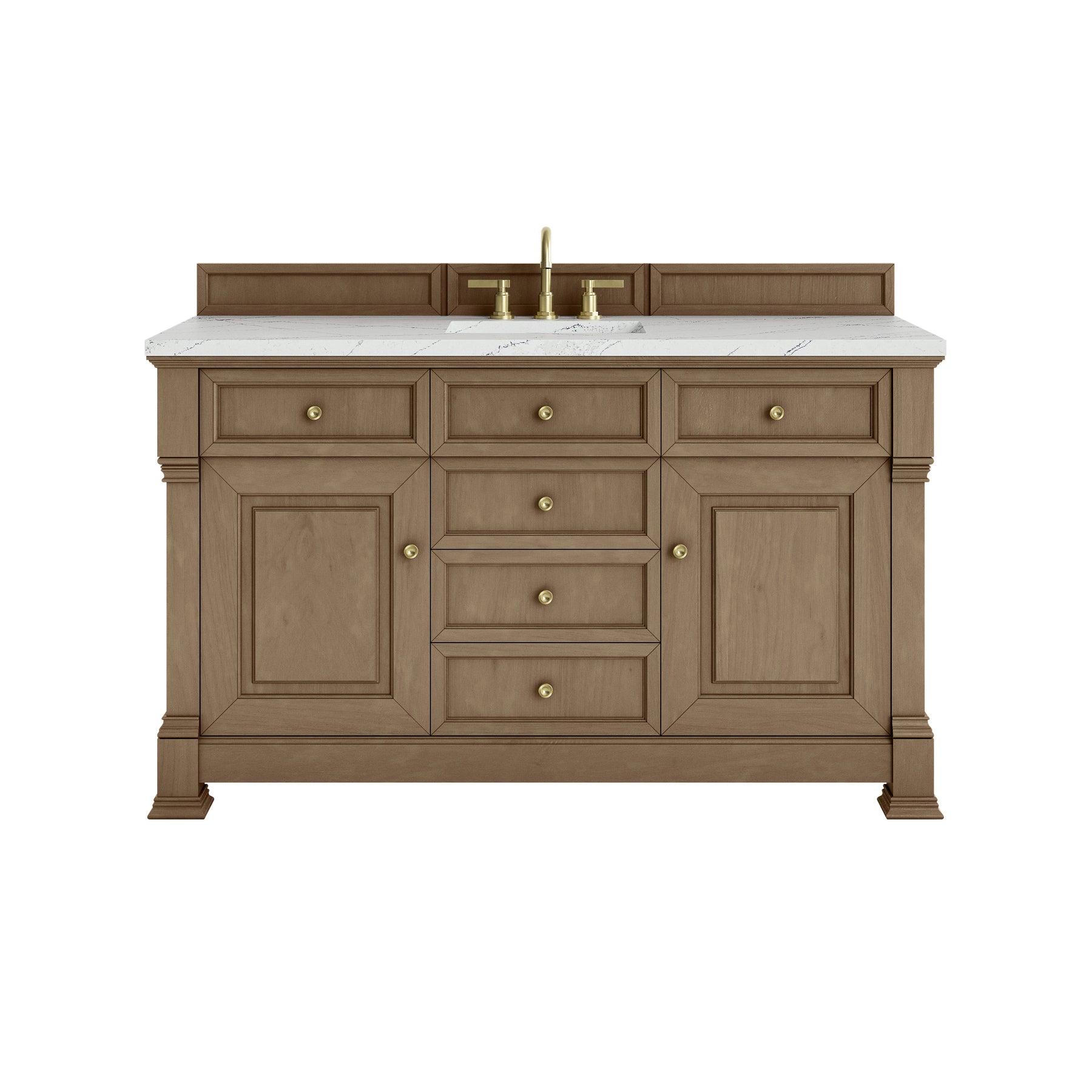 The Brookfield 60" Single Vanity in Pecan by James Martin Vanities offers a blend of traditional elegance and contemporary sophistication. The raised panel picture frame doors and detailed corner molding reflect timeless craftsmanship, while the Pecan finish and Champagne Brass hardware lend a fresh, modern appeal. This beautifully crafted vanity features two single-door cabinets that open to interior shelves, along with five standard drawers for ample storage. The cool wood tones highlight the natural Oak wood grains, lending sophistication and charm to your space. The addition of an Ethereal Noctis Silestone® top with undermount sink completes the look.