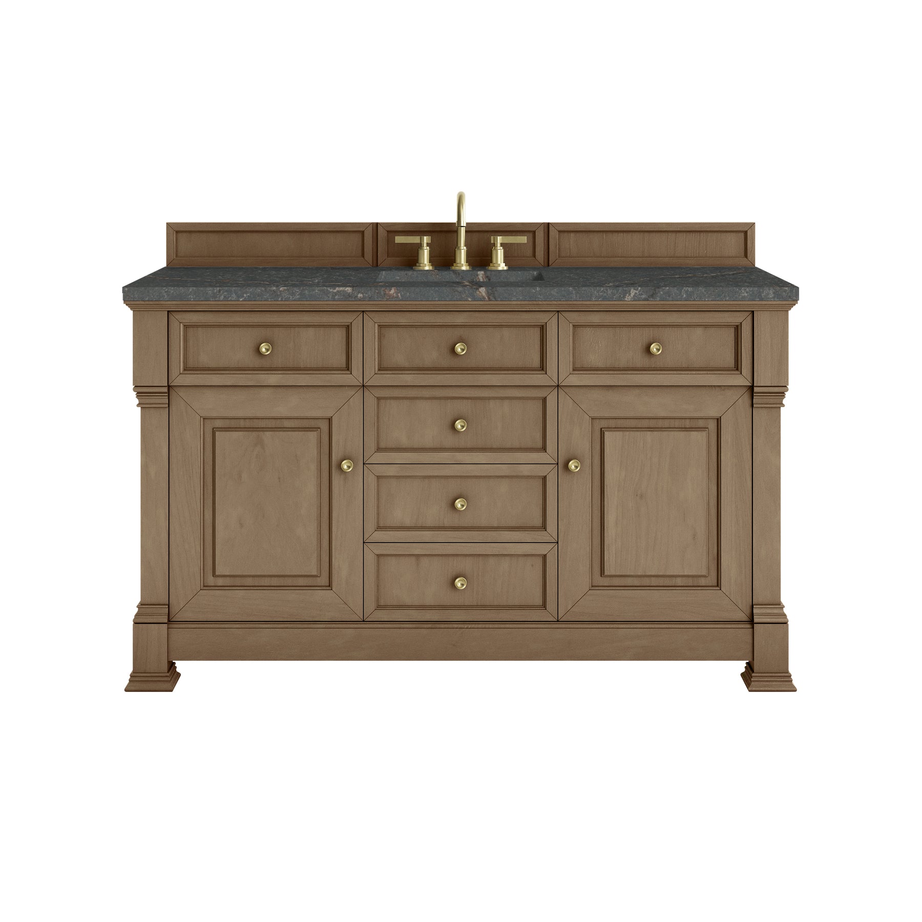 The Brookfield 60" Single Vanity in Pecan by James Martin Vanities offers a blend of traditional elegance and contemporary sophistication. The raised panel picture frame doors and detailed corner molding reflect timeless craftsmanship, while the Pecan finish and Champagne Brass hardware lend a fresh, modern appeal. This beautifully crafted vanity features two single-door cabinets that open to interior shelves, along with five standard drawers for ample storage. The cool wood tones highlight the natural Oak wood grains, lending sophistication and charm to your space. The addition of a Parisien Bleu Silestone® top featuring copper veining and an undermount sink completes the look.