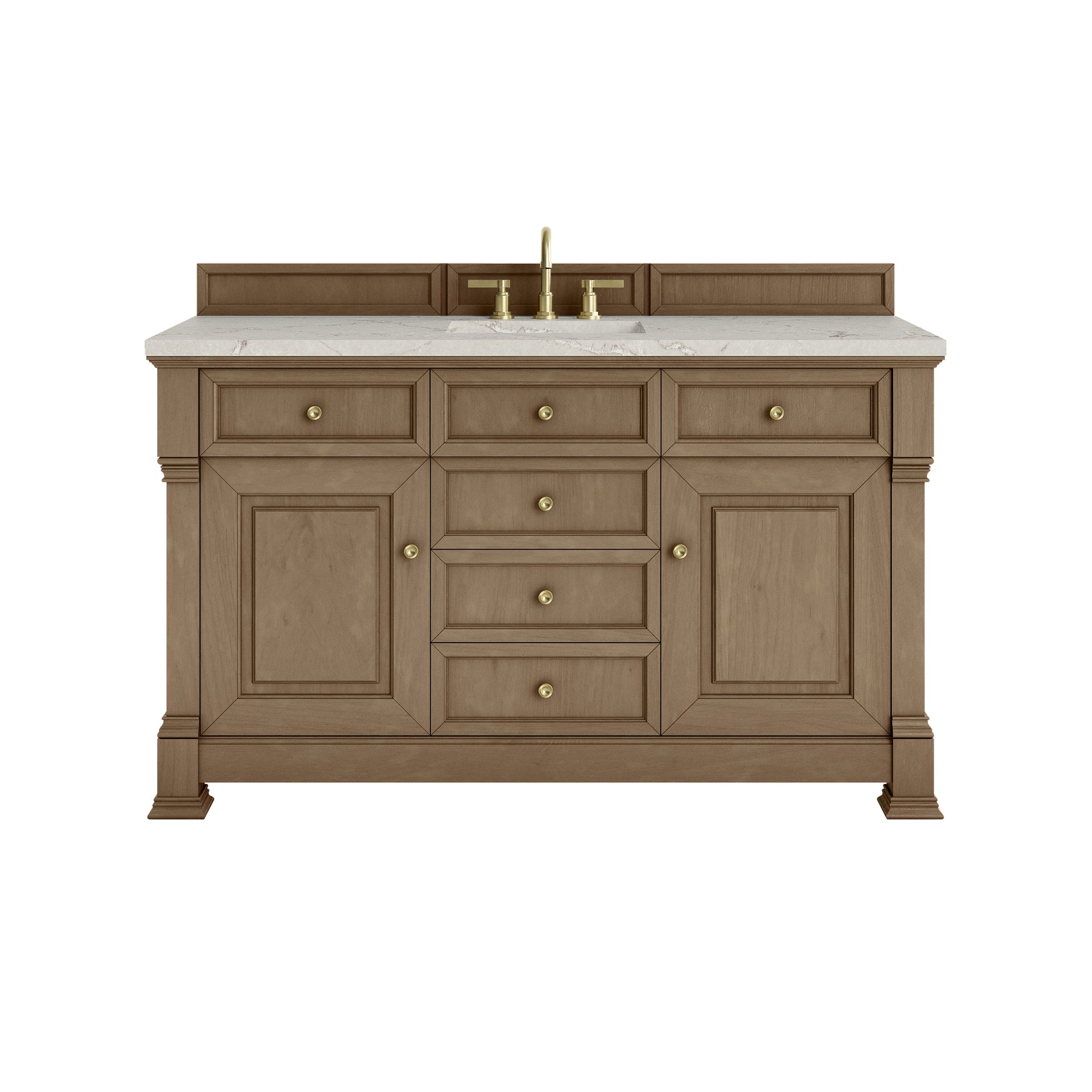 The Brookfield 60" Single Vanity in Pecan by James Martin Vanities offers a blend of traditional elegance and contemporary sophistication. The raised panel picture frame doors and detailed corner molding reflect timeless craftsmanship, while the Pecan finish and Champagne Brass hardware lend a fresh, modern appeal. This beautifully crafted vanity features two single-door cabinets that open to interior shelves, along with five standard drawers for ample storage. The cool wood tones highlight the natural Oak wood grains, lending sophistication and charm to your space. The addition of a Victorian Silver Silestone® top featuring a neutral white and gray background with fine silver veining, along with an undermount sink, completes the look.