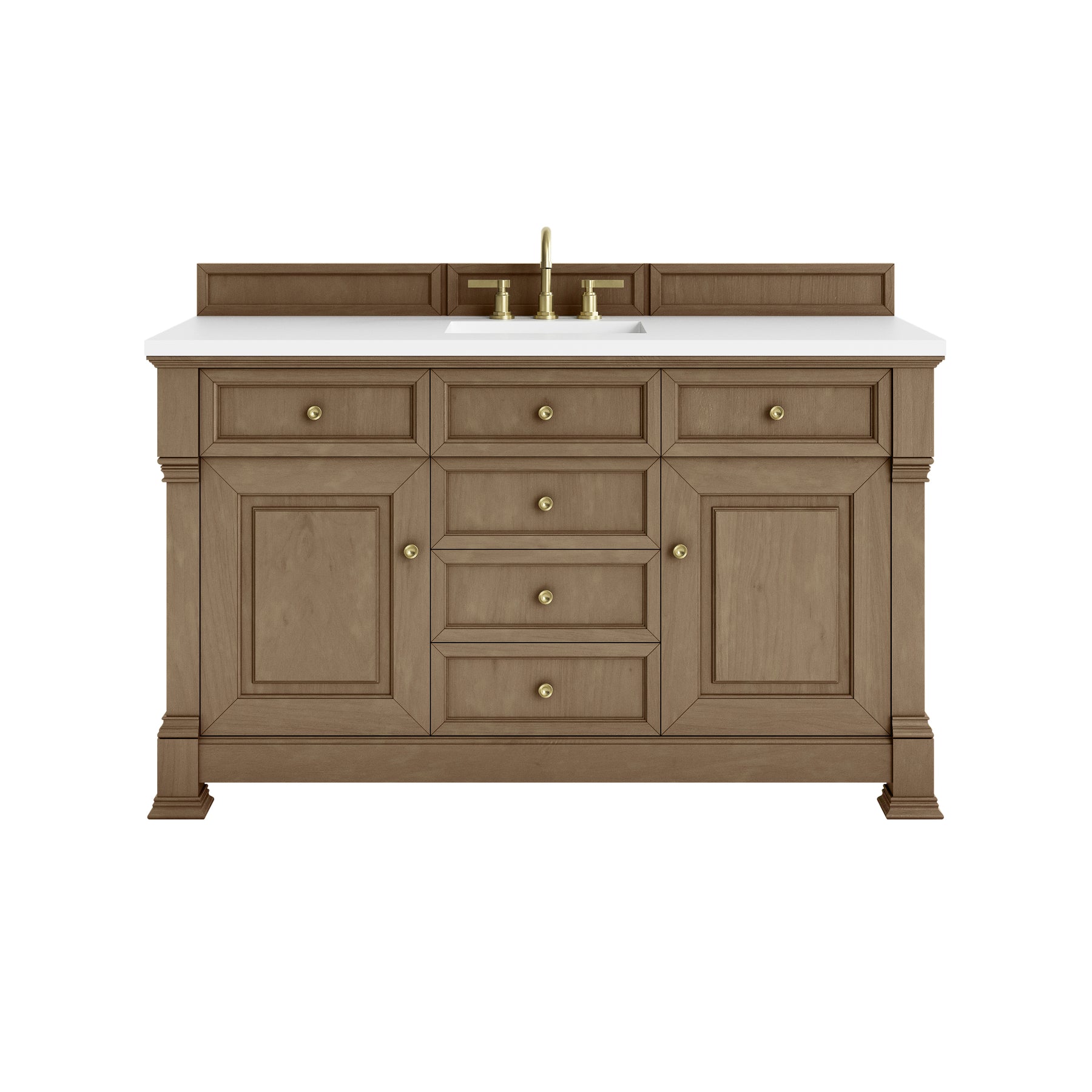 The Brookfield 60" Single Vanity in Pecan by James Martin Vanities offers a blend of traditional elegance and contemporary sophistication. The raised panel picture frame doors and detailed corner molding reflect timeless craftsmanship, while the Pecan finish and Champagne Brass hardware lend a fresh, modern appeal. This beautifully crafted vanity features two single door cabinets that open to interior shelves, along with five standard drawers for ample storage. The cool wood tones highlight the natural Oak wood grains, lending sophistication and charm to your space. A classic White Zeus Silestone® top with undermount sink completes the look.