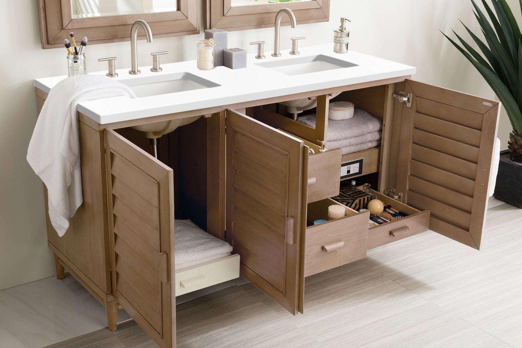 The Portland 72" Whitewashed Walnut Single Vanity features soft-close hinges on doors, with undermount soft-close slides on drawers and concealed ample storage. A proportionate and complementary design with wood knobs and brushed aluminum interior drawers. Premium features include one bamboo drawer organizer and one electrical component with two USB outlets. The look is completed with a 3 CM eased edge White Zeus Silestone top and two white ceramic rectangular sinks.