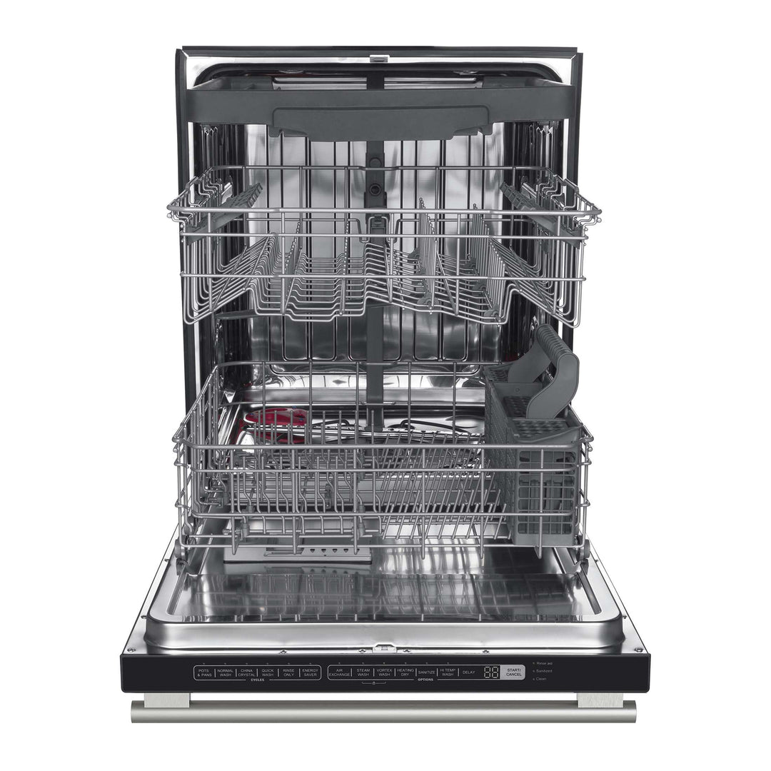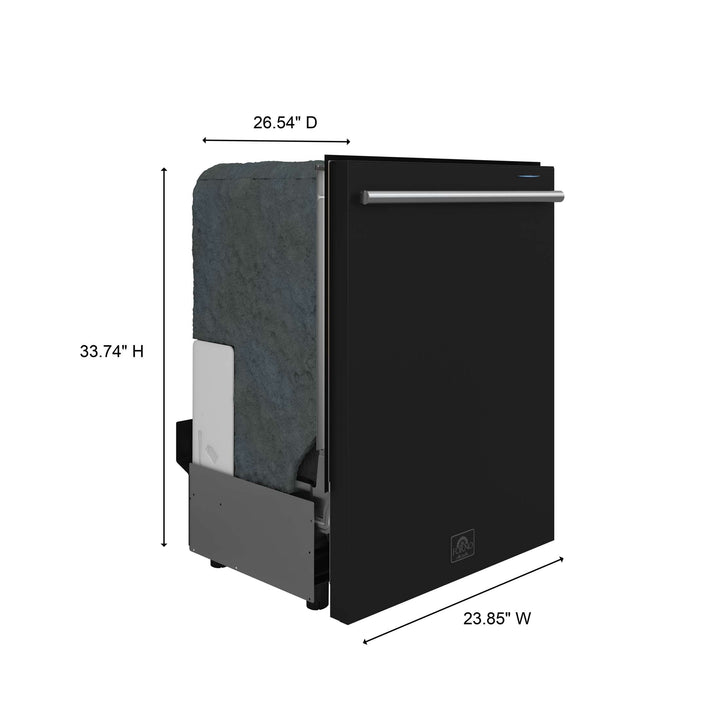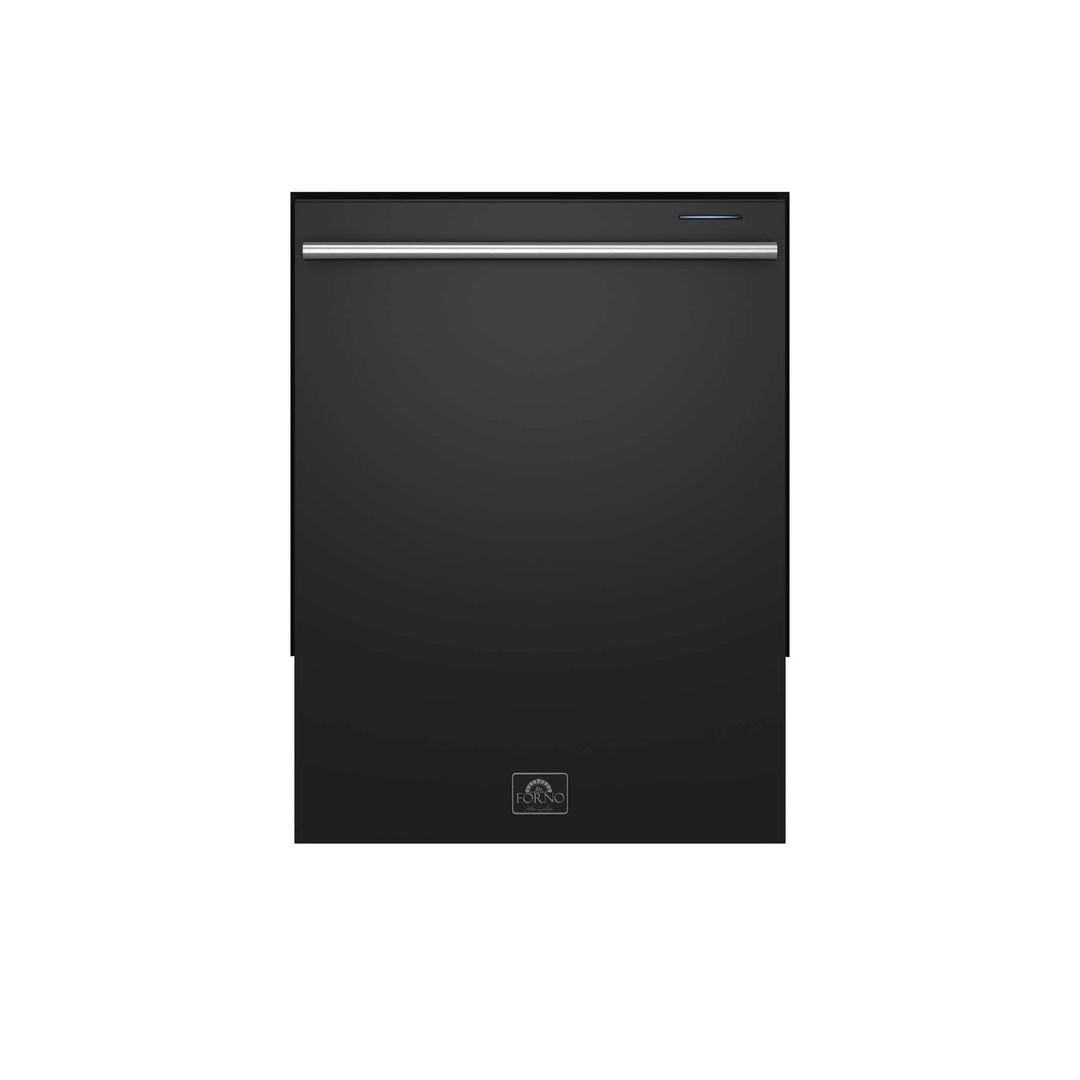 The Forno Pozzo 24" Dishwasher in black with antique brass handle delivers powerful cleaning performance with six wash programs to handle everything from delicate glassware to heavy-duty pots and pans. Operating at a quiet 49 dB, it ensures a peaceful kitchen environment while maintaining Energy Star Certification for efficiency and cost savings. Built with a robust stainless steel tall tub, this dishwasher offers enhanced durability and a sleek, modern aesthetic. The double drying system combines heat drying and fan drying for spotless, ready-to-use dishes. Enjoy effortless control with electronic touch controls, an LED display, and a front cycle progress indicator. The flexible 3-rack design, complete with a silverware basket and an adjustable upper third rack, maximizes loading capacity. Additional features include a 24-hour delay start for added convenience, an air exchange system that refreshes the interior every six hours, and low energy consumption of just 240 kWh per year, making it an eco-friendly and high-performance choice for any kitchen.