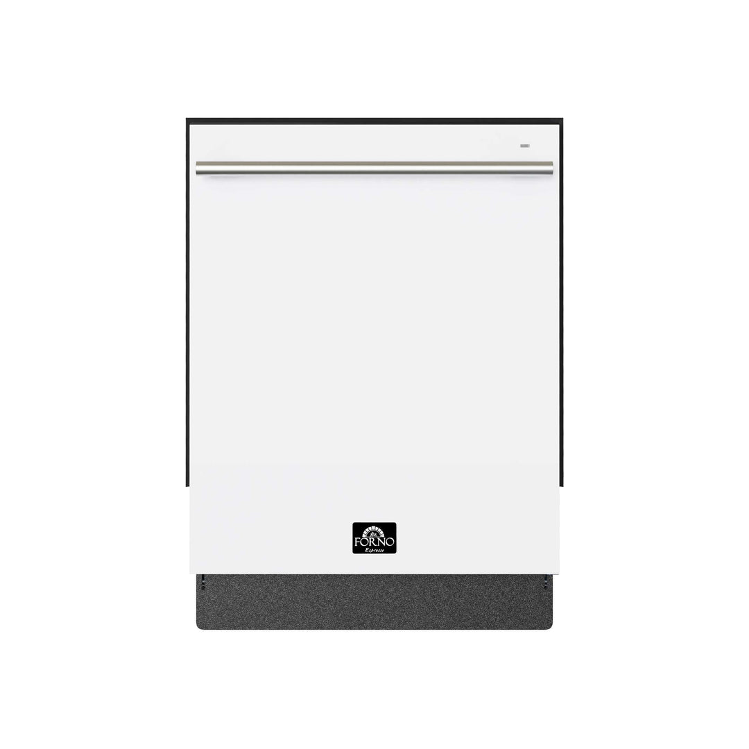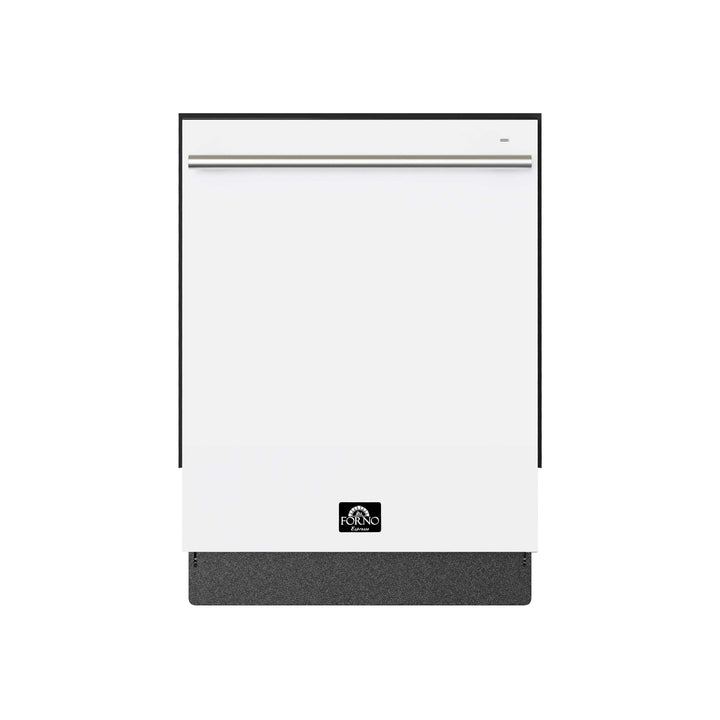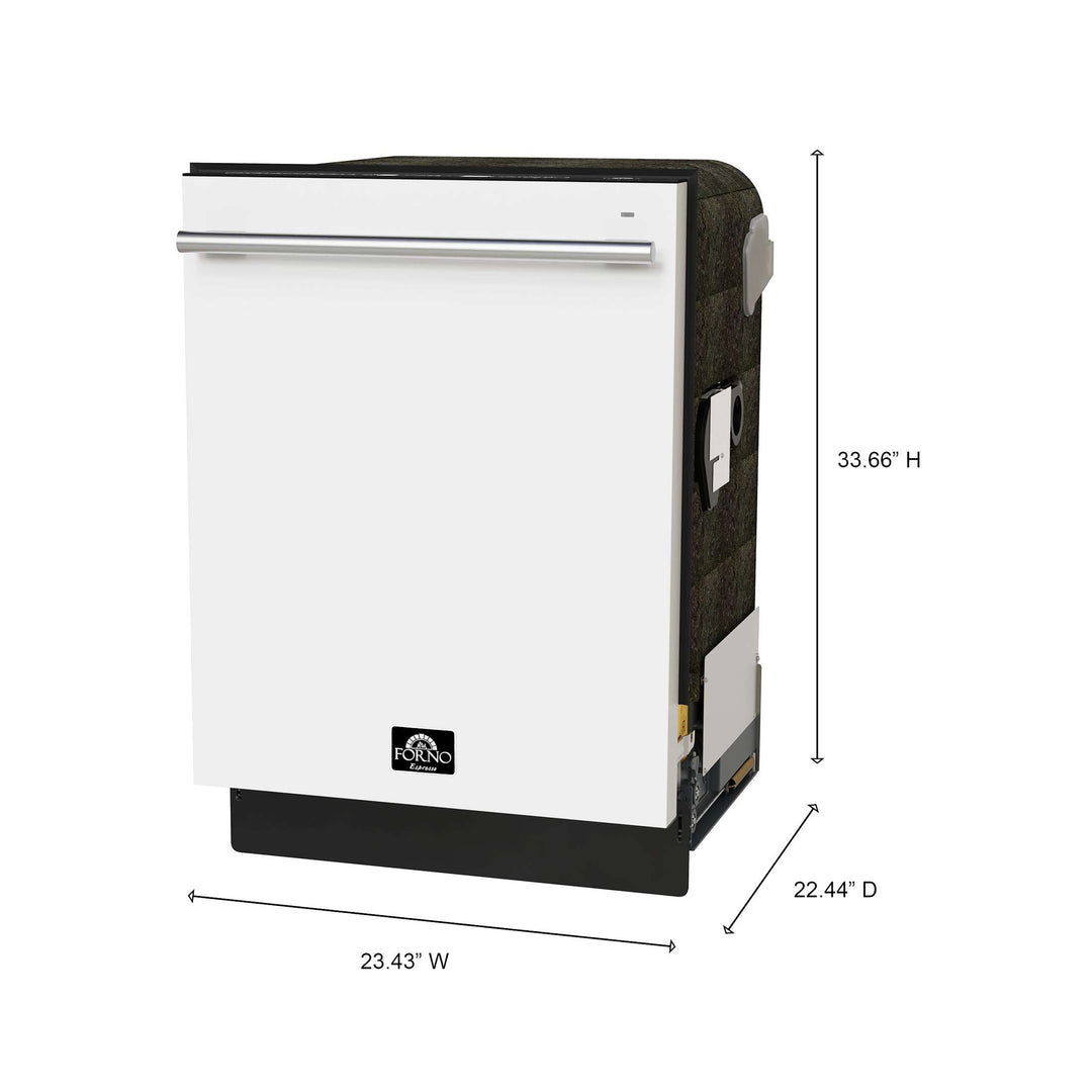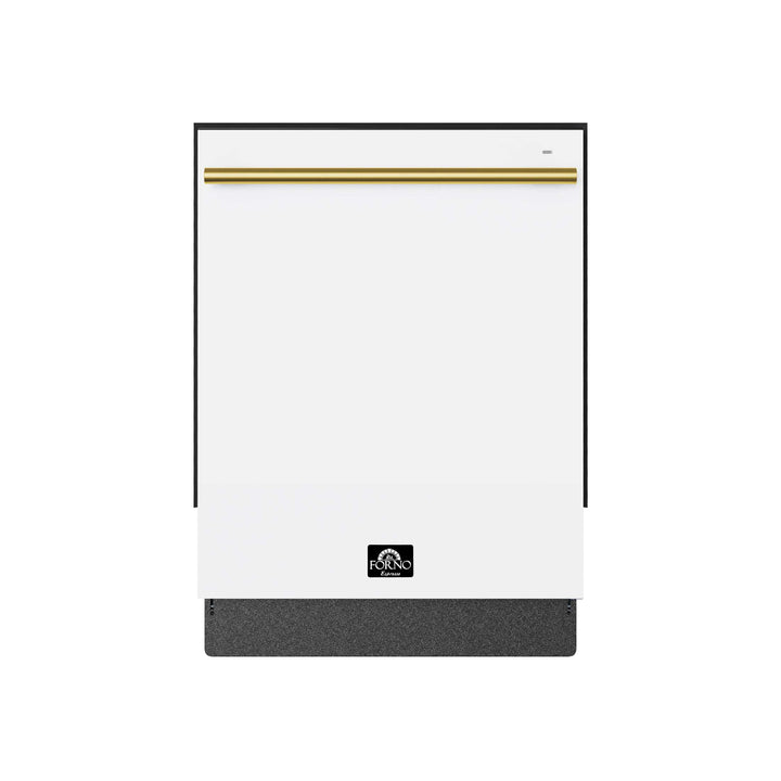 The Forno Romano 24" Tall-Tub Dishwasher combines powerful performance with quiet operation, running at just 52 decibels for a peaceful kitchen environment. Designed for both style and durability, its sleek white front and pro-style handle antique brass handle enhance any modern kitchen. Inside, the spacious stainless-steel tub features three racks and an additional silverware basket, providing flexible loading for large dish capacities and various utensils. Seven wash programs and intuitive electronic controls with an LED display ensure efficient and customizable cleaning. The advanced three-rack design includes foldable tines in the lower rack, making room for large or irregularly shaped cookware. A 30-minute quick wash cycle handles lightly soiled dishes with ease, while the delay start option lets you schedule washes up to 24 hours in advance. For spotless drying, the double drying system combines heat and fan drying, while an air exchange system refreshes the interior every two hours to prevent odors. Interior illumination activates when the door opens, improving visibility. Energy Star Certified for efficiency, this dishwasher saves energy and water without compromising on performance.