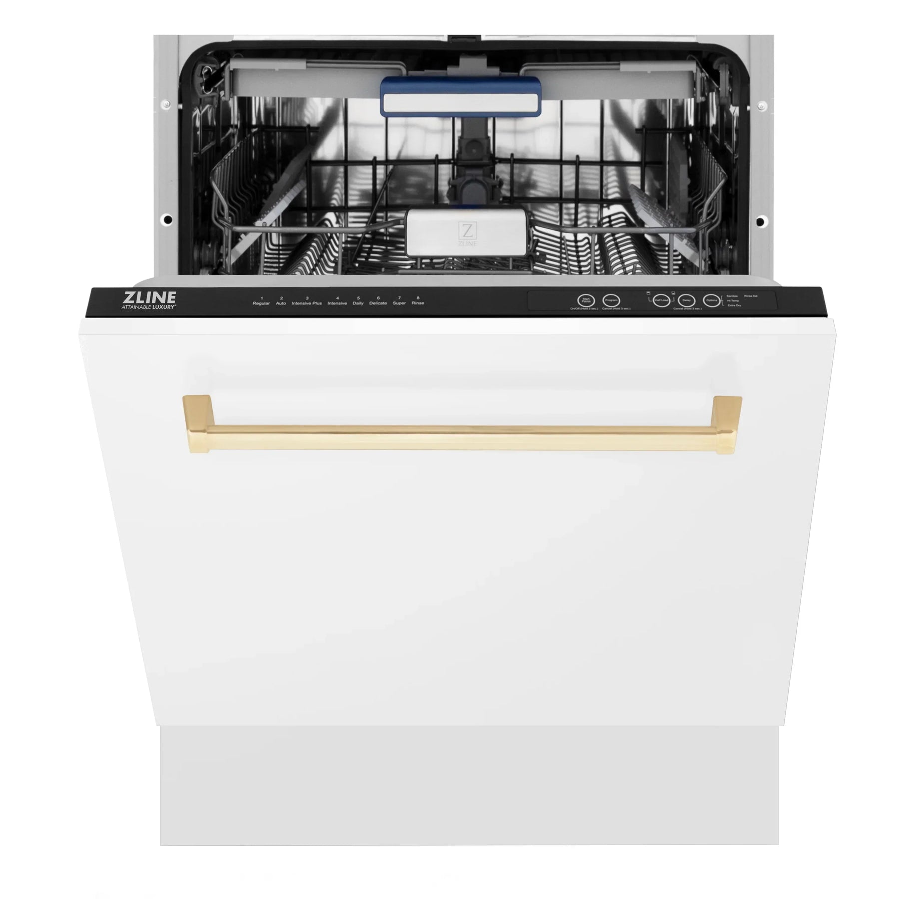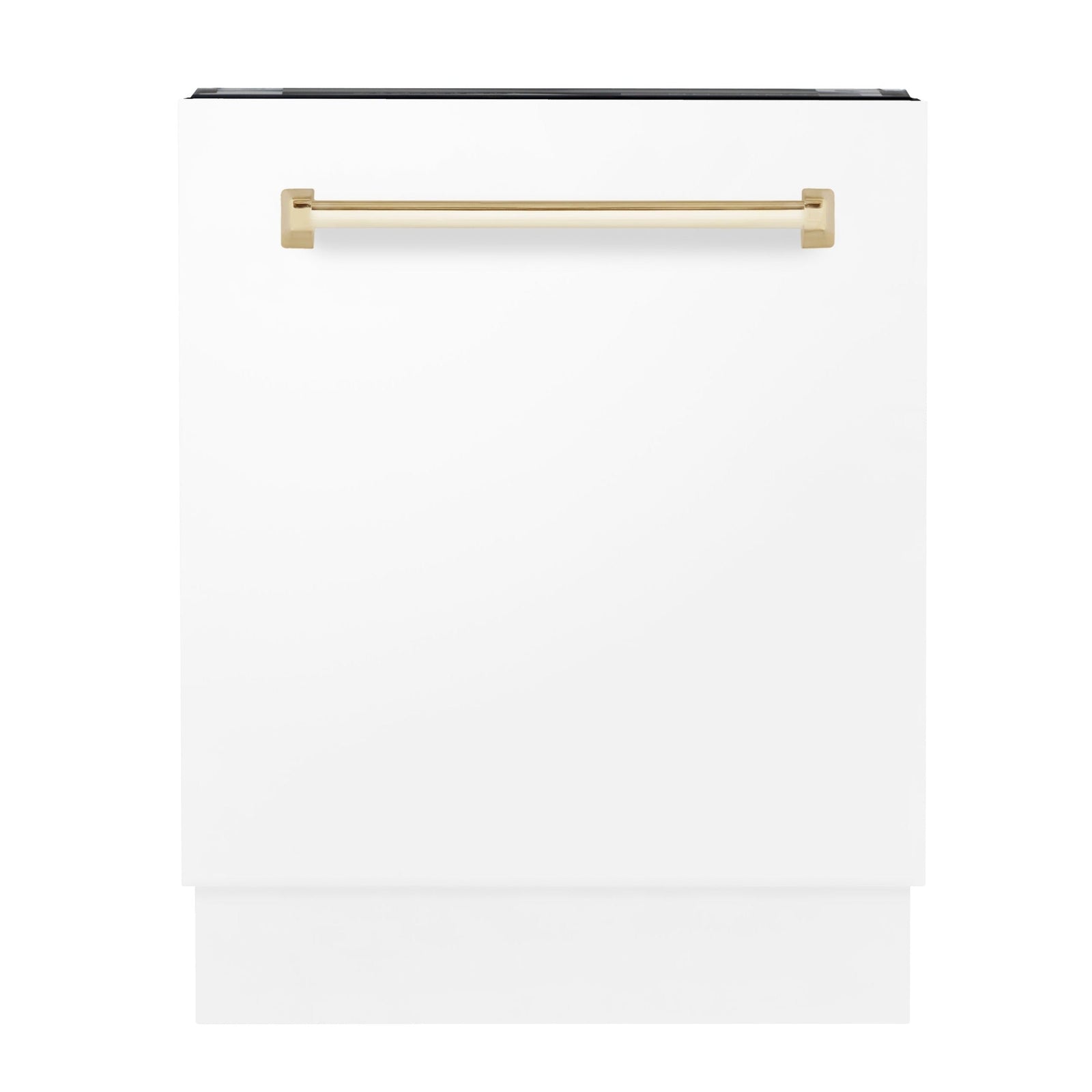 The ZLINE Autograph White Matte Dishwasher (DWVZ-WM-24-G) comes fully equipped with 3 racks, maximizing place settings with a stunning Gold Handle. Clean your dishes with ease with this ZLINE Dishwasher!