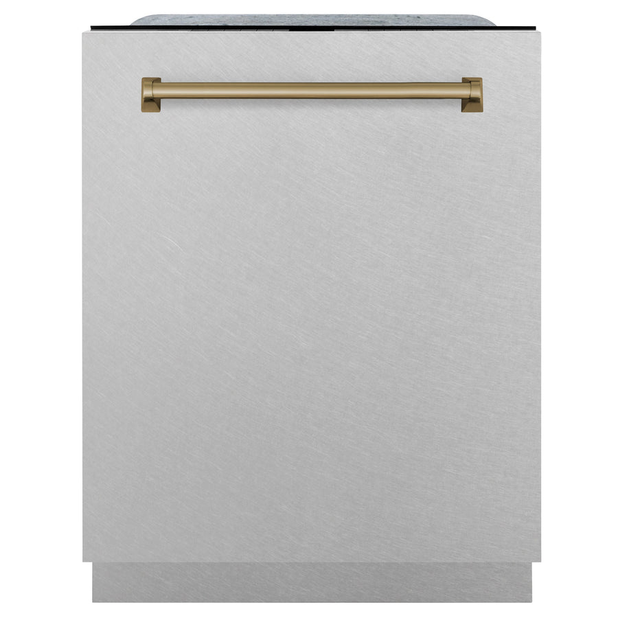 ZLINE Autograph Series 24 inch Tall Dishwasher in DuraSnow® Stainless Steel with Gold Handle, DWVZ-SN-24-G