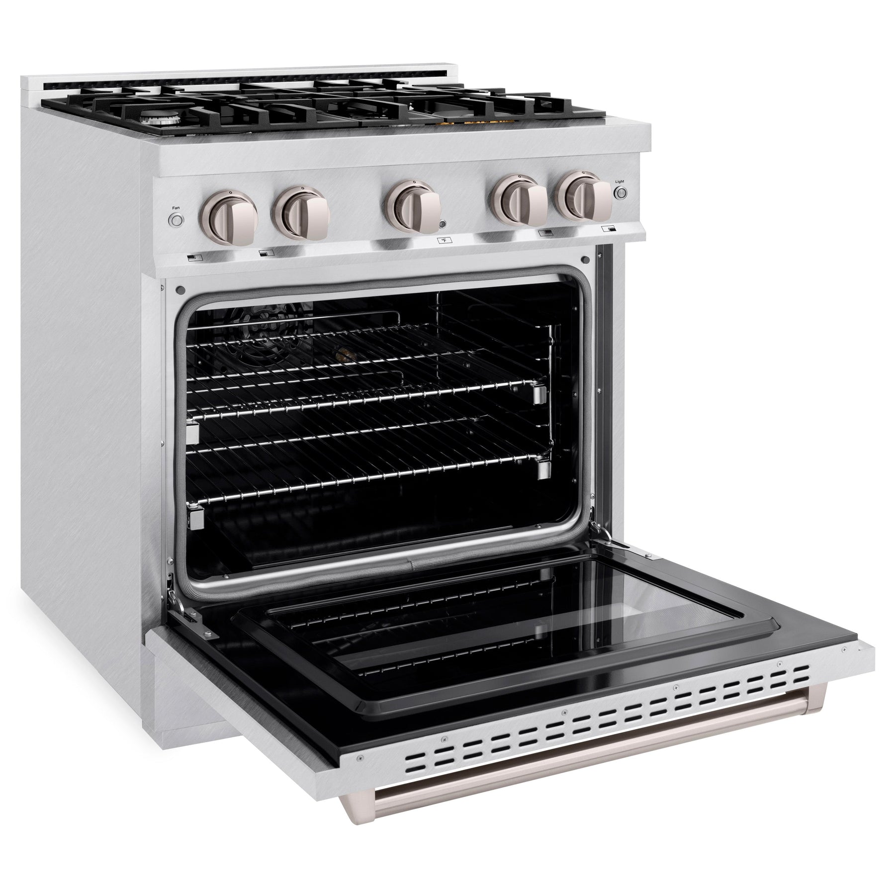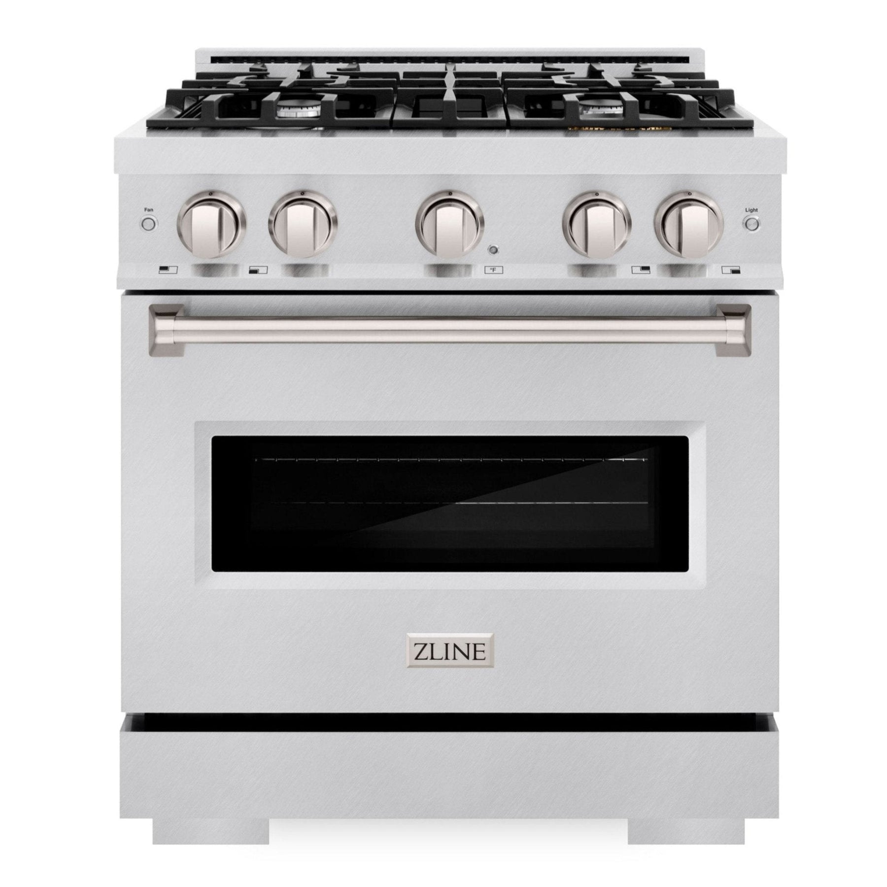 The ZLINE 30" 4.2 cu. ft. Classic Gas Range with 4 Burner Cooktop and Convection Gas Oven in DuraSnow Stainless Steel (CGRS-30) combines the elegance of a hand-finished porcelain gas cooktop with 4 Italian-made auto-reignition burners, a gas convection oven with an energy-efficient cooling fan to ensure quiet operation, and a Landscape oven door window design allowing you to master every meal. With a modern, timeless style and refined functionality, ZLINE Classic Gas Ranges are masterfully crafted to deliver an elevated culinary experience.
