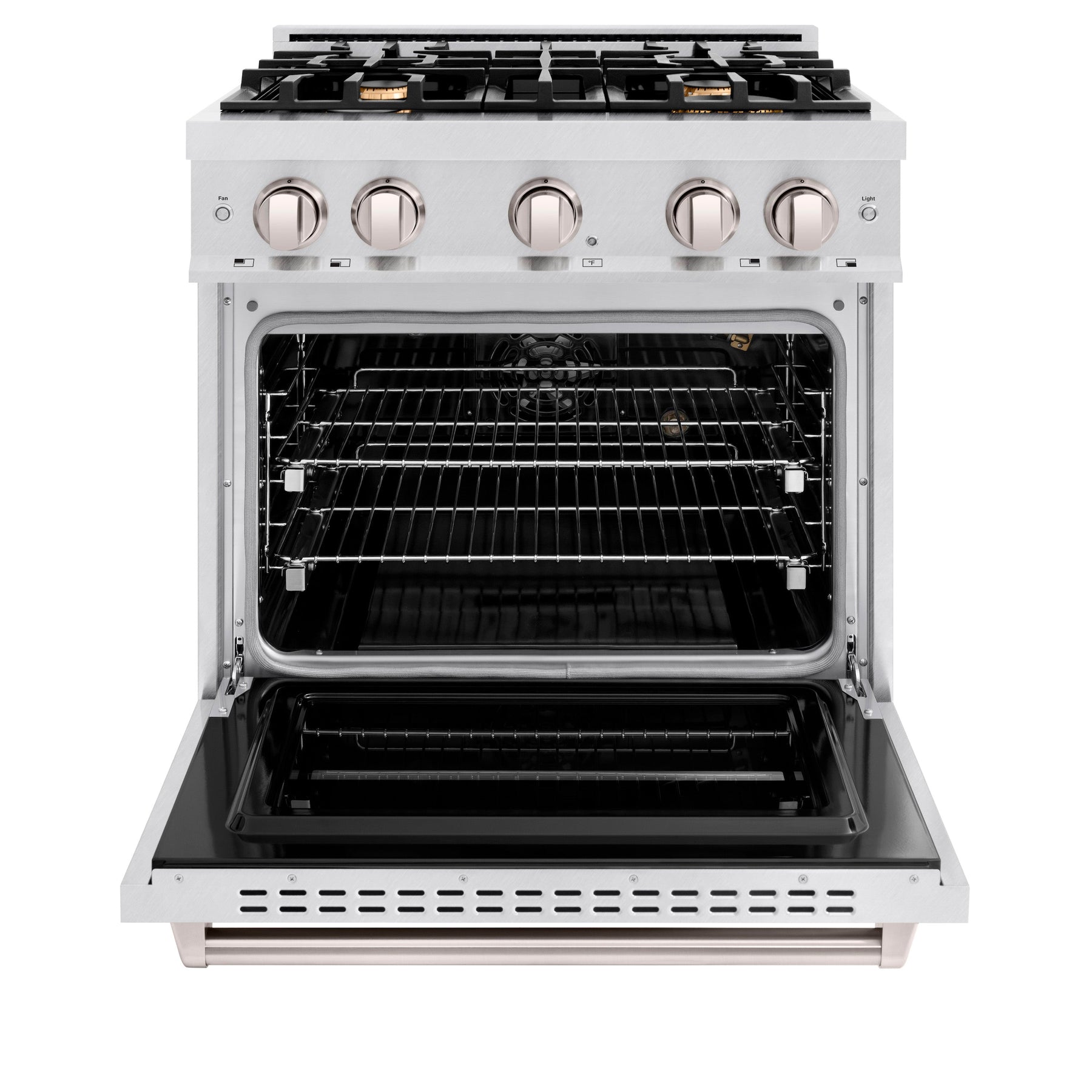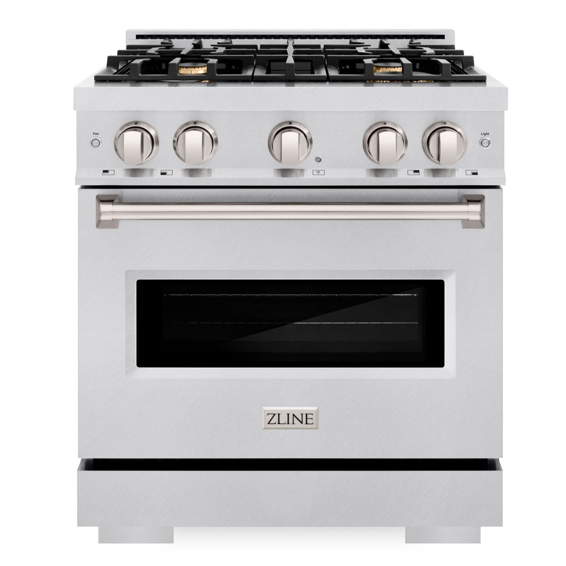 The ZLINE 30" 4.2 cu. ft. Classic Gas Range with Convection Gas Oven in DuraSnow Stainless Steel with 4 Brass Burners (CGRS-BR-30) combines the elegance of a hand-finished porcelain gas cooktop with 4 Italian-made brass auto-reignition burners, a gas convection oven with an energy-efficient cooling fan to ensure quiet operation, and a Landscape oven door window design allowing you to master every meal. With a modern, timeless style and refined functionality, ZLINE Classic Gas Ranges are masterfully crafted to deliver an elevated culinary experience.