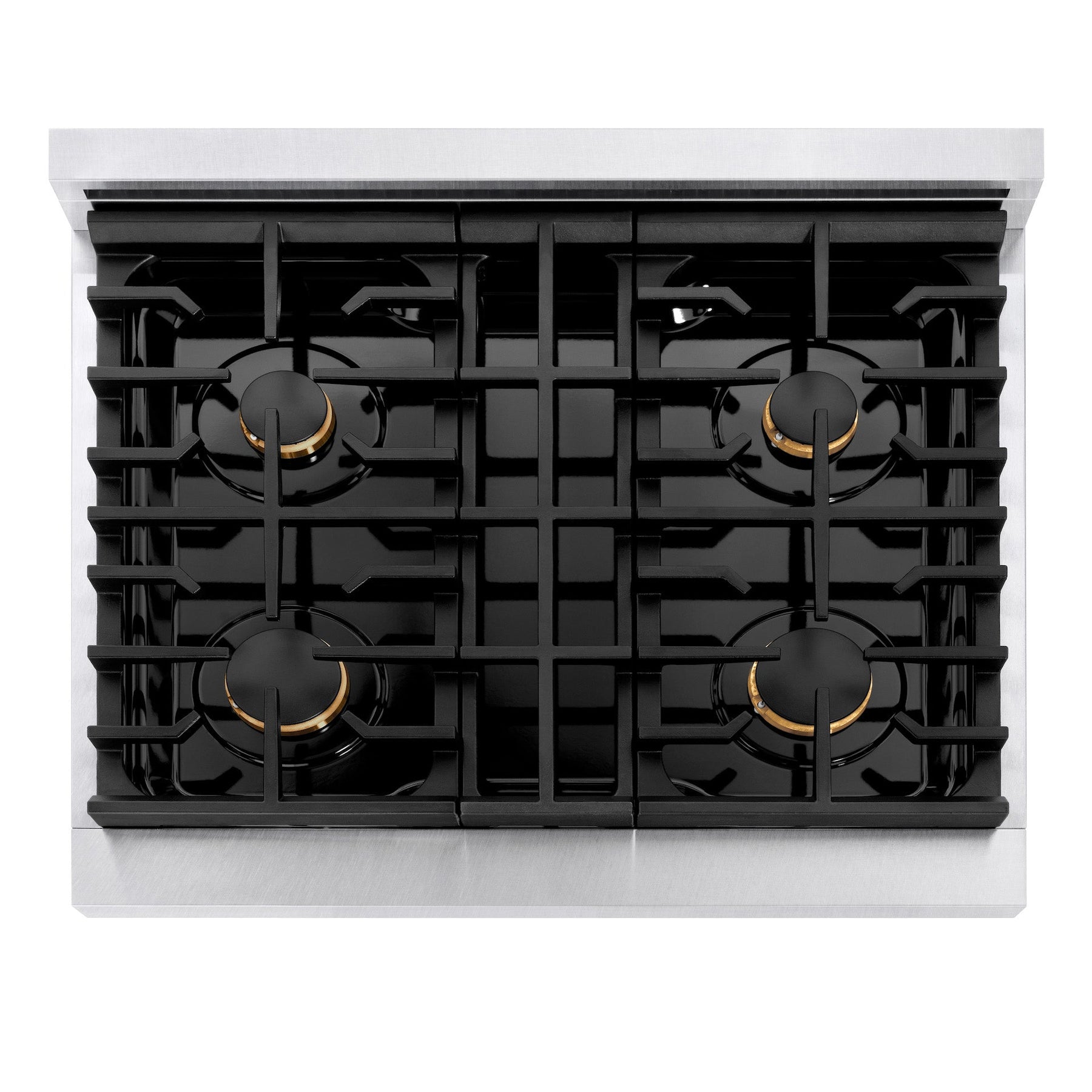• Italian-Made Sealed Brass Burners: ZLINE's Italian brass burners add a sophisticated, timeless touch of color to this range, while offering enhanced cooking benefits like superior heat retention and even flame distribution.