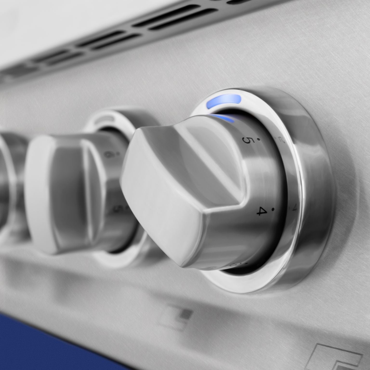 • LED Knob Indicators. Front control knobs will illuminate when the cooktop or oven is in use, providing additional safety and convenience