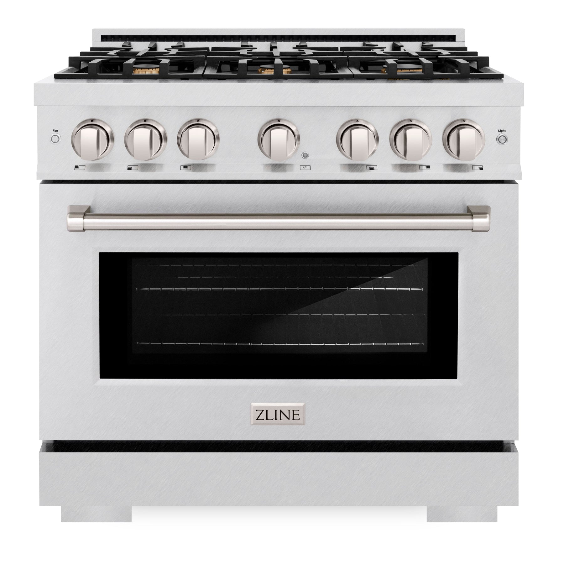 The ZLINE 36" 5.2 cu. ft. Select Gas Range with Convection Gas Oven in DuraSnow Stainless Steel with 6 Brass Burners (HGRS-BR-36) combines the elegance of a hand-finished porcelain gas cooktop with 6 Italian-made brass auto-reignition burners, a gas convection oven with an energy-efficient cooling fan to ensure quiet operation, and a Horizon oven door window design allowing you to master every meal. With a modern, timeless style and refined functionality, ZLINE Select Gas Ranges are masterfully crafted to deliver an elevated culinary experience.