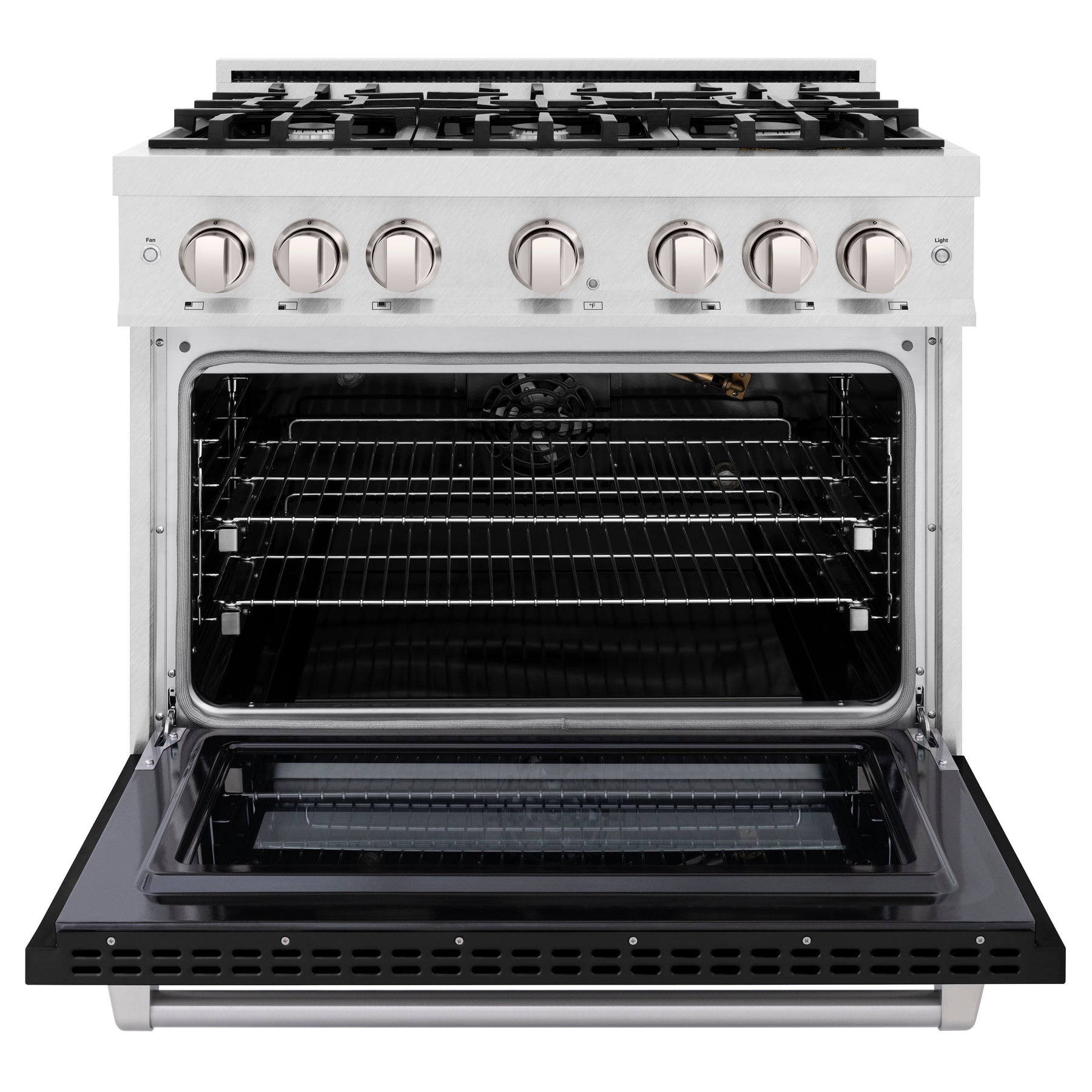 The ZLINE 36" 5.2 cu. ft. Select Gas Range with 6 Burner Cooktop and Convection Gas Oven in DuraSnow Stainless Steel with Black Matte Door (HGRS-BLM-36) combines the elegance of a hand-finished porcelain gas cooktop with 6 Italian-made auto-reignition burners, a gas convection oven with an energy-efficient cooling fan to ensure quiet operation, and a beautiful black matte door with a Horizon window design allowing you to master every meal. With a modern, timeless style and refined functionality, ZLINE Select Gas Ranges are masterfully crafted to deliver an elevated culinary experience.