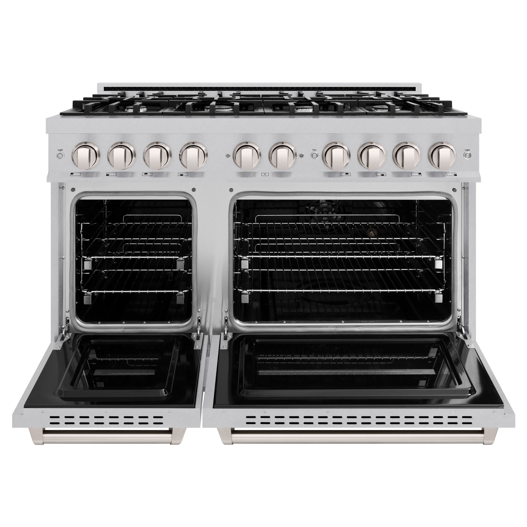 The ZLINE 48" 6.7 cu. ft. Classic Double Oven Dual Fuel Range with 8 Burner Gas Cooktop in DuraSnow Stainless Steel (CDRS-48) combines the elegance of a hand-finished porcelain gas cooktop with 8 Italian-made auto-reignition burners, a large electric convection oven with an energy-efficient cooling fan to ensure quiet operation, a small bake-and-broil oven, and Landscape oven door window designs allowing you to master every meal. With a modern, timeless style and refined functionality, ZLINE Classic Dual Fuel Ranges are masterfully crafted to deliver an elevated culinary experience.