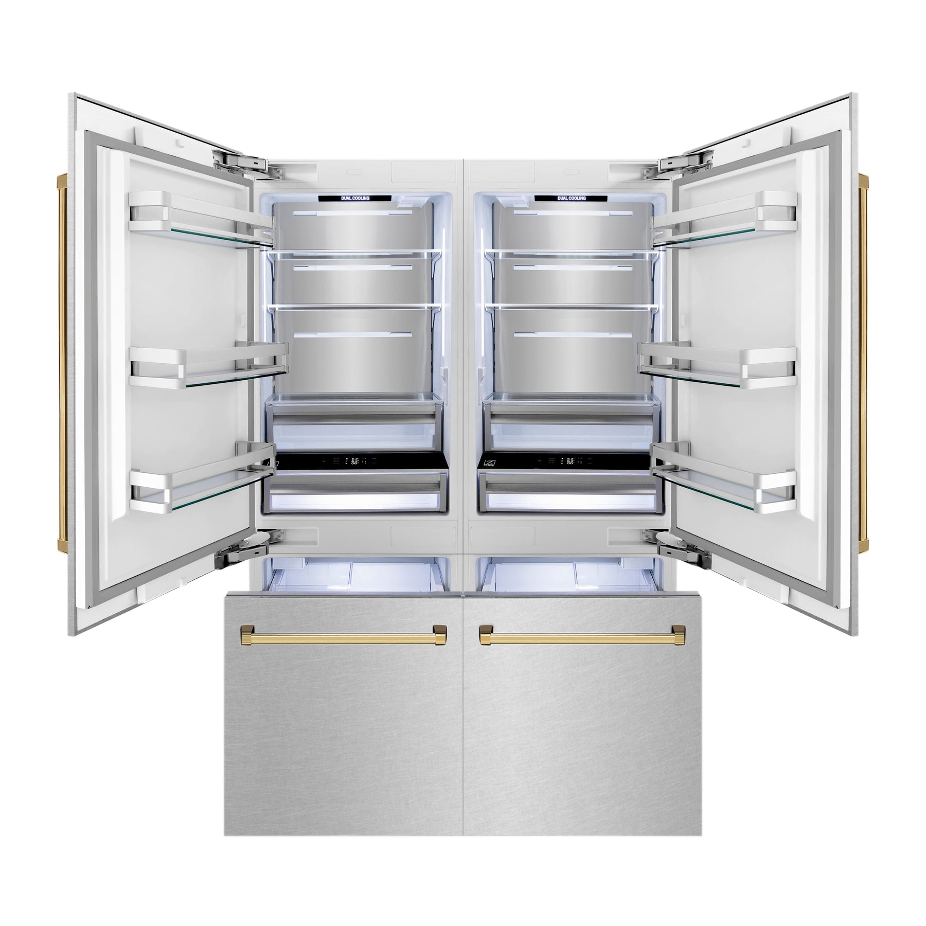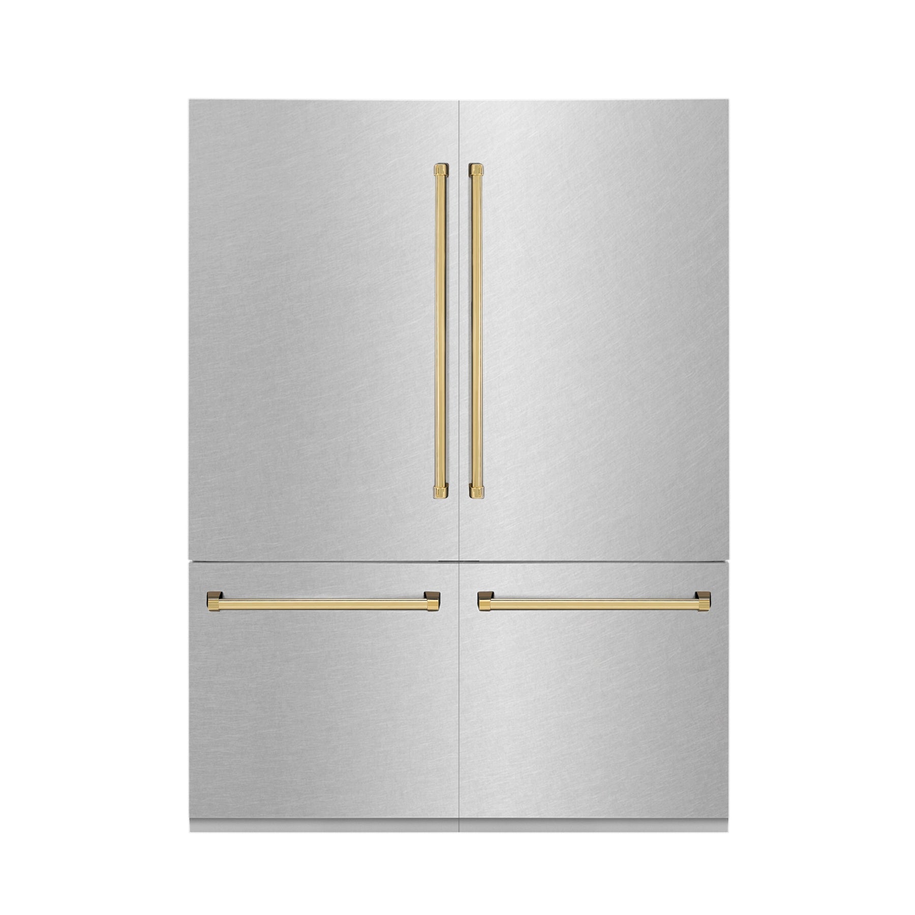 Enhance your kitchen with the ZLINE Autograph Durasnow 60" 32.2 cu. ft. Built-In 4-Door Bottom Freezer Refrigerator. This refrigerator combines high-quality performance with classic design, offering advanced capabilities such as adjustable temperatures, RapidChill Mode, and a concealed internal water and ice dispenser. Experience ZLINE's Attainable Luxury with this refrigerator, seamlessly blending innovation, elegance, and efficiency.