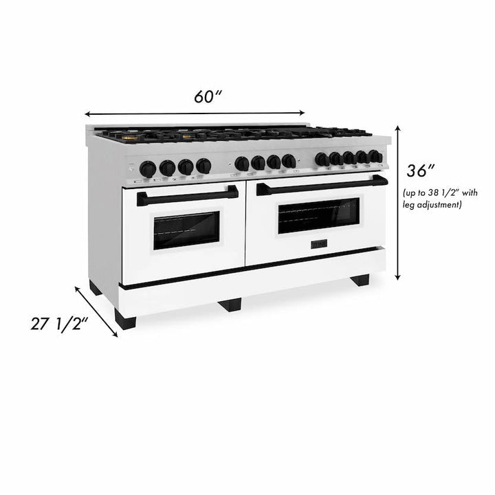 Luxury isn't meant to be desired - it's meant to be attainable. Designed in Lake Tahoe, USA, the ZLINE Autograph Edition 60" 7.4 cu. ft. Dual Fuel Range with Gas Stove and Electric Oven in DuraSnow® Fingerprint Resistant Stainless Steel with White Matte Door and Matte Black Accents (RASZ-WM-60-MB) provides a professional culinary experience by pairing unmatched performance with timeless style. Achieve ZLINE Attainable Luxury® excellence with innovative features designed to enhance your kitchen's capability.