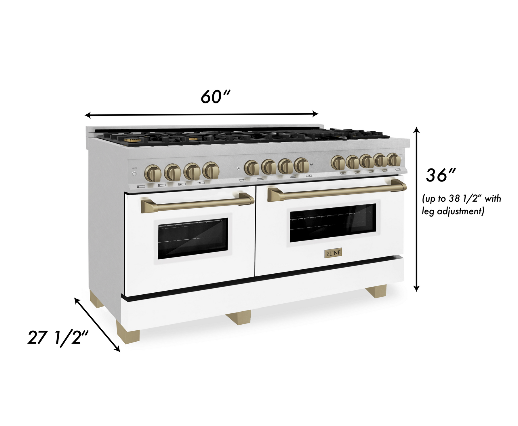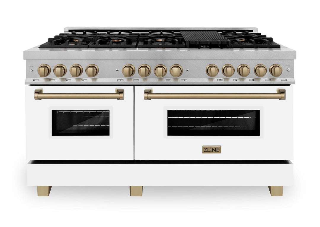 - Create a custom kitchen with easy installation - this Autograph Edition range is pre-assembled and shipped out complete with a white matte oven door, brass burners, and champagne bronze knobs, handles, and legs.
