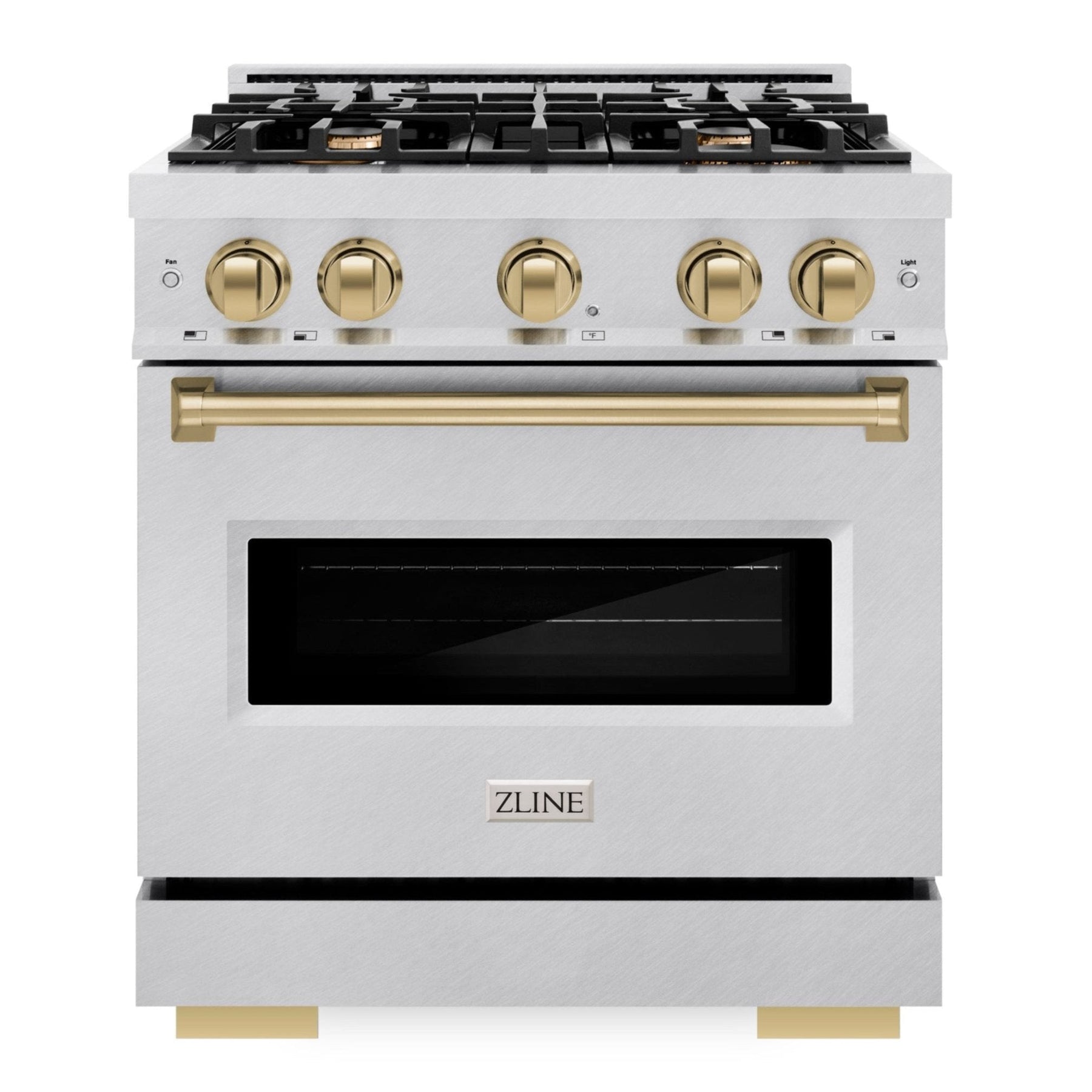 The ZLINE Autograph Edition 30" 4.2 cu. ft. Classic Gas Range with 4 Burner Cooktop and Convection Gas Oven in DuraSnow Stainless Steel and Champagne Bronze Accents (CGRSZ-30-CB) combines the elegance of a hand-finished porcelain gas cooktop with 4 Italian-made auto-reignition burners, a gas convection oven with an energy-efficient cooling fan to ensure quiet operation, a Landscape oven door window design, and stunning champagne bronze knobs and handle allowing you to master every meal. With a modern, timeless style and refined functionality, ZLINE Classic Gas Ranges are masterfully crafted to deliver an elevated culinary experience.