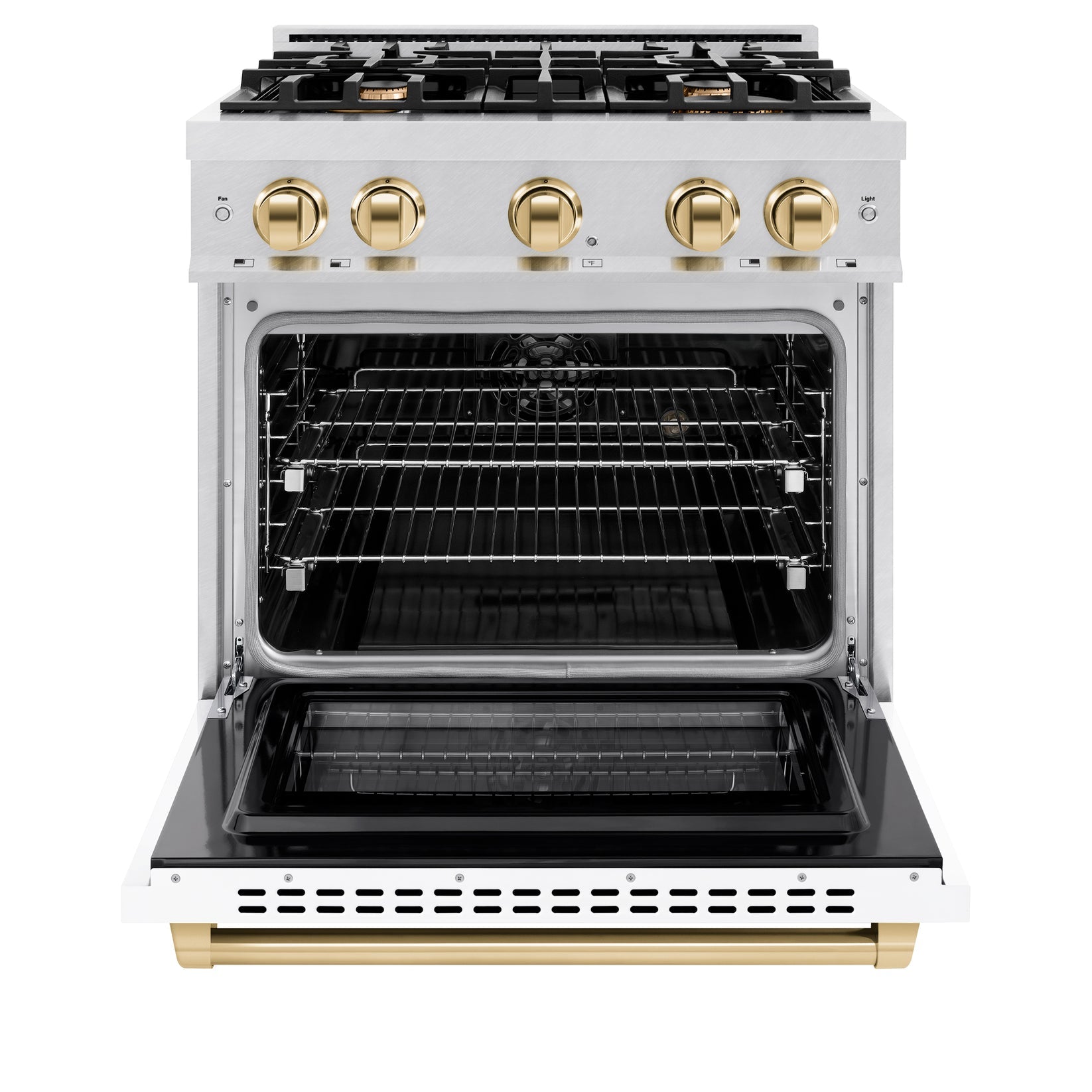 The ZLINE Autograph Edition 30" 4.2 cu. ft. Select Dual Fuel Range with 4 Burner Gas Cooktop and Electric Convection Oven in DuraSnow Stainless Steel with White Matte Door and Polished Gold Accents (HDRSZ-WM-30-G) combines the elegance of a hand-finished porcelain gas cooktop with 4 Italian-made auto-reignition burners, an electric convection oven with an energy-efficient cooling fan to ensure quiet operation, a beautiful white matte door with a Horizon window design, and stunning polished gold knobs and handle allowing you to master every meal. With a modern, timeless style and refined functionality, ZLINE Select Dual Fuel Ranges are masterfully crafted to deliver an elevated culinary experience.