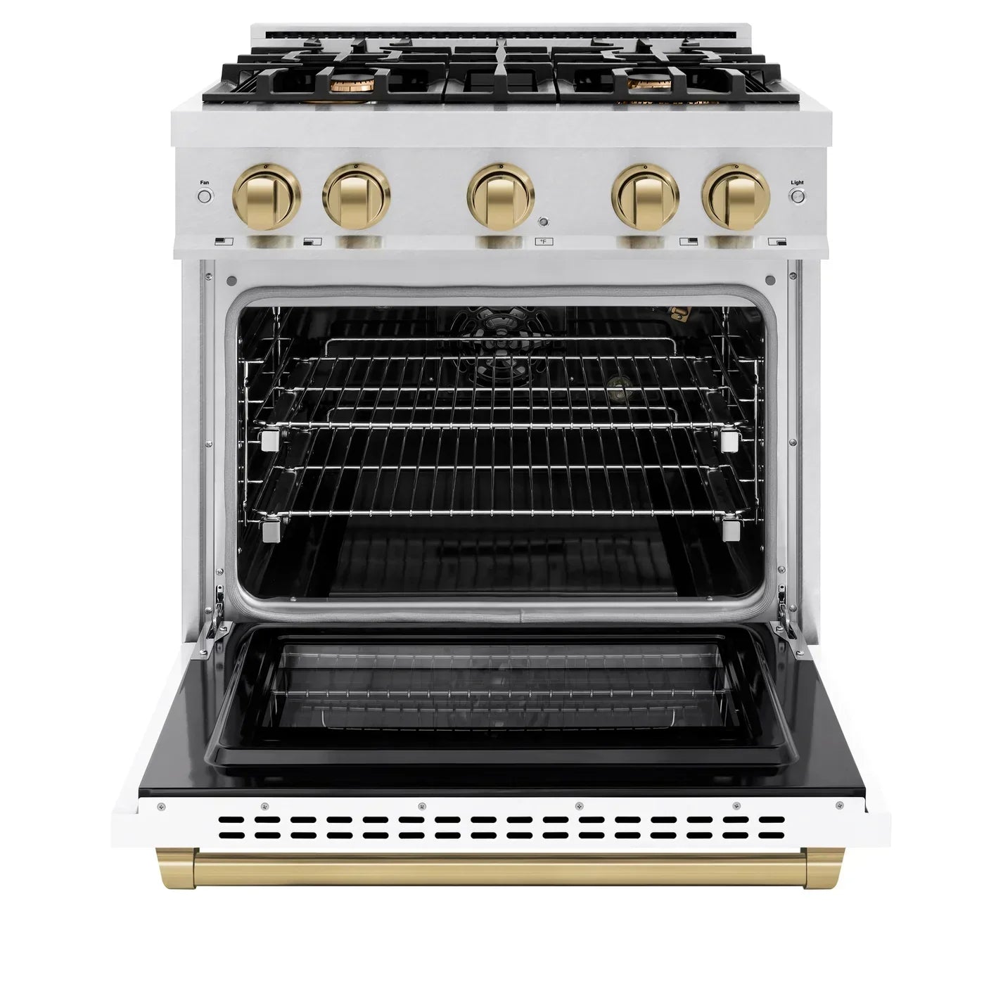 The ZLINE Autograph Edition 30" 4.2 cu. ft. Select Gas Range with 4 Burner Cooktop and Convection Gas Oven in DuraSnow Stainless Steel with White Matte Door and Champagne Bronze Accents (HGRSZ-WM-30-CB) combines the elegance of a hand-finished porcelain gas cooktop with 4 Italian-made auto-reignition burners, a gas convection oven with an energy-efficient cooling fan to ensure quiet operation, a beautiful white matte door with a Horizon window design, and stunning champagne bronze knobs and handle allowing you to master every meal. With a modern, timeless style and refined functionality, ZLINE Select Gas Ranges are masterfully crafted to deliver an elevated culinary experience.