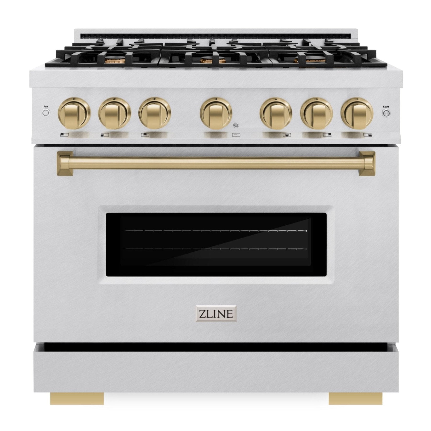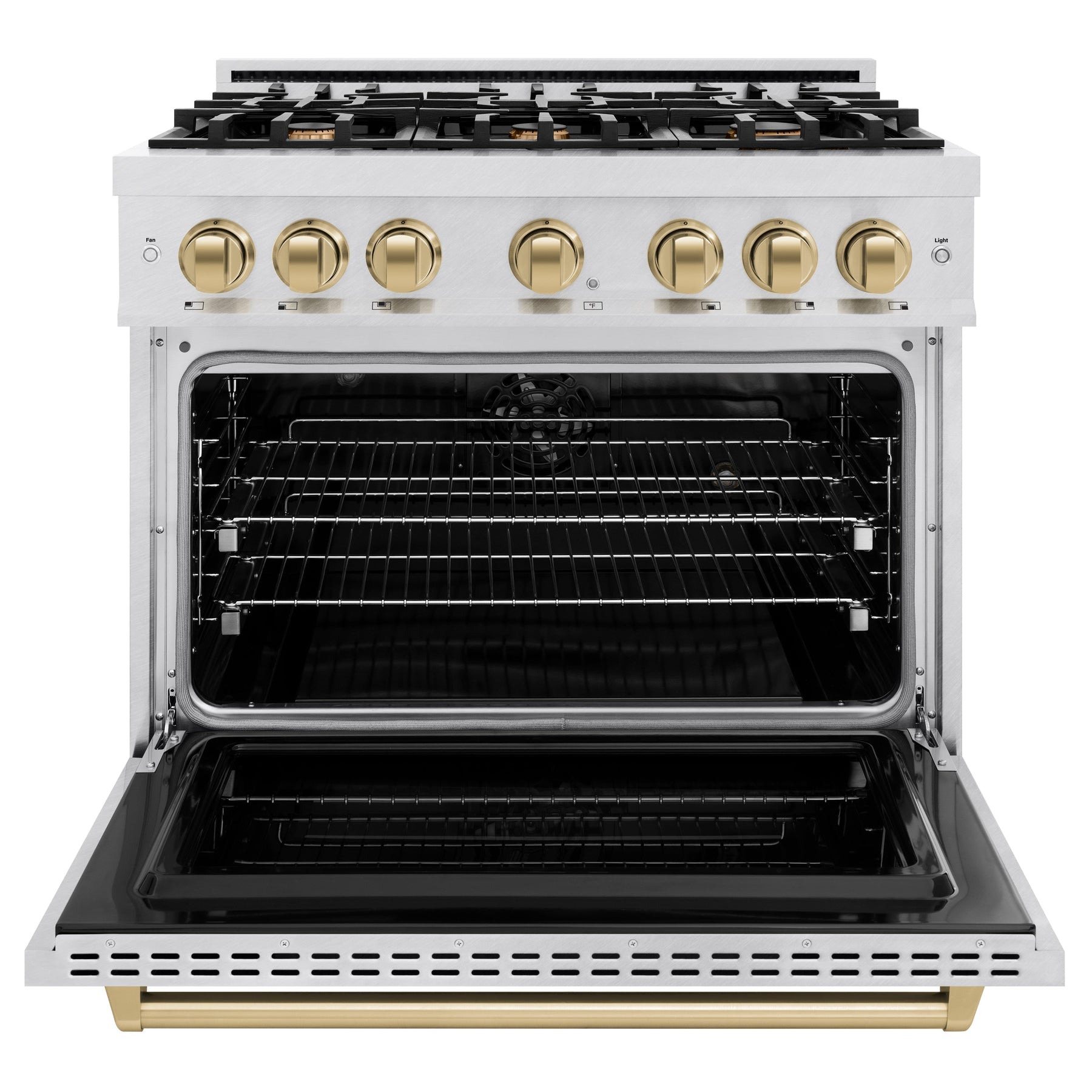 The ZLINE Autograph Edition 36" 5.2 cu. ft. Classic Dual Fuel Range with 6 Burner Gas Cooktop and Electric Convection Oven in DuraSnow Stainless Steel with Champagne Bronze Accents (CDRSZ-36-CB) combines the elegance of a hand-finished porcelain gas cooktop with 6 Italian-made auto-reignition burners, an electric convection oven with an energy-efficient cooling fan to ensure quiet operation, a Landscape oven door window design, and stunning champagne bronze knobs and handle allowing you to master every meal. With a modern, timeless style and refined functionality, ZLINE Classic Dual Fuel Ranges are masterfully crafted to deliver an elevated culinary experience.