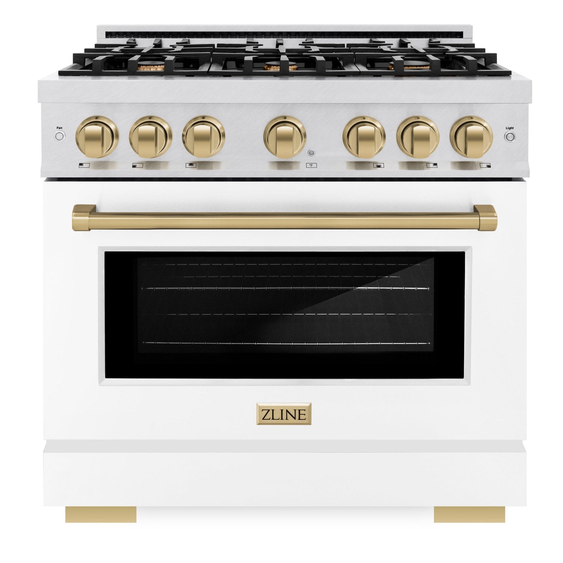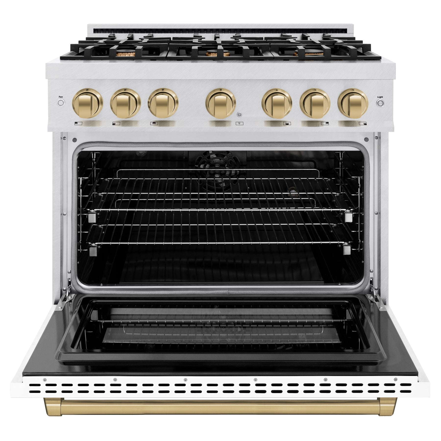 The ZLINE Autograph Edition 36" 5.2 cu. ft. Select Dual Fuel Range with 6 Burner Gas Cooktop and Electric Convection Oven in DuraSnow Stainless Steel with White Matte Door and Champagne Bronze Accents (HDRSZ-WM-36-CB) combines the elegance of a hand-finished porcelain gas cooktop with 6 Italian-made auto-reignition burners, an electric convection oven with an energy-efficient cooling fan to ensure quiet operation, a beautiful white matte door with a Horizon window design, and stunning champagne bronze knobs and handle allowing you to master every meal. With a modern, timeless style and refined functionality, ZLINE Select Dual Fuel Ranges are masterfully crafted to deliver an elevated culinary experience.