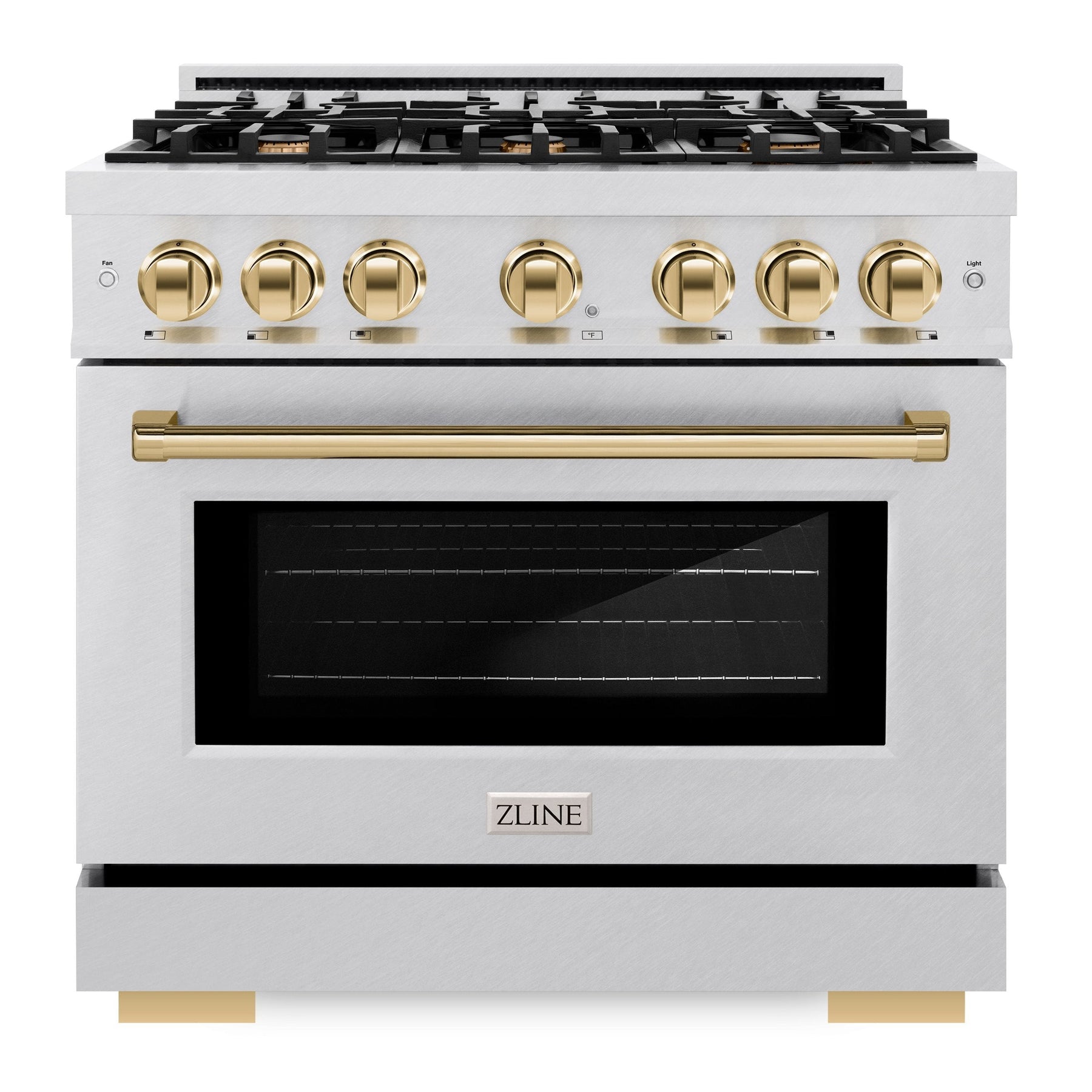 The ZLINE Autograph Edition 36" 5.2 cu. ft. Select Gas Range with 6 Burner Cooktop and Convection Gas Oven in DuraSnow Stainless Steel and Polished Gold Accents (HGRSZ-36-G) combines the elegance of a hand-finished porcelain gas cooktop with 6 Italian-made auto-reignition burners, a gas convection oven with an energy-efficient cooling fan to ensure quiet operation, a Horizon oven door window design, and stunning polished gold knobs and handle allowing you to master every meal. With a modern, timeless style and refined functionality, ZLINE Select Gas Ranges are masterfully crafted to deliver an elevated culinary experience.