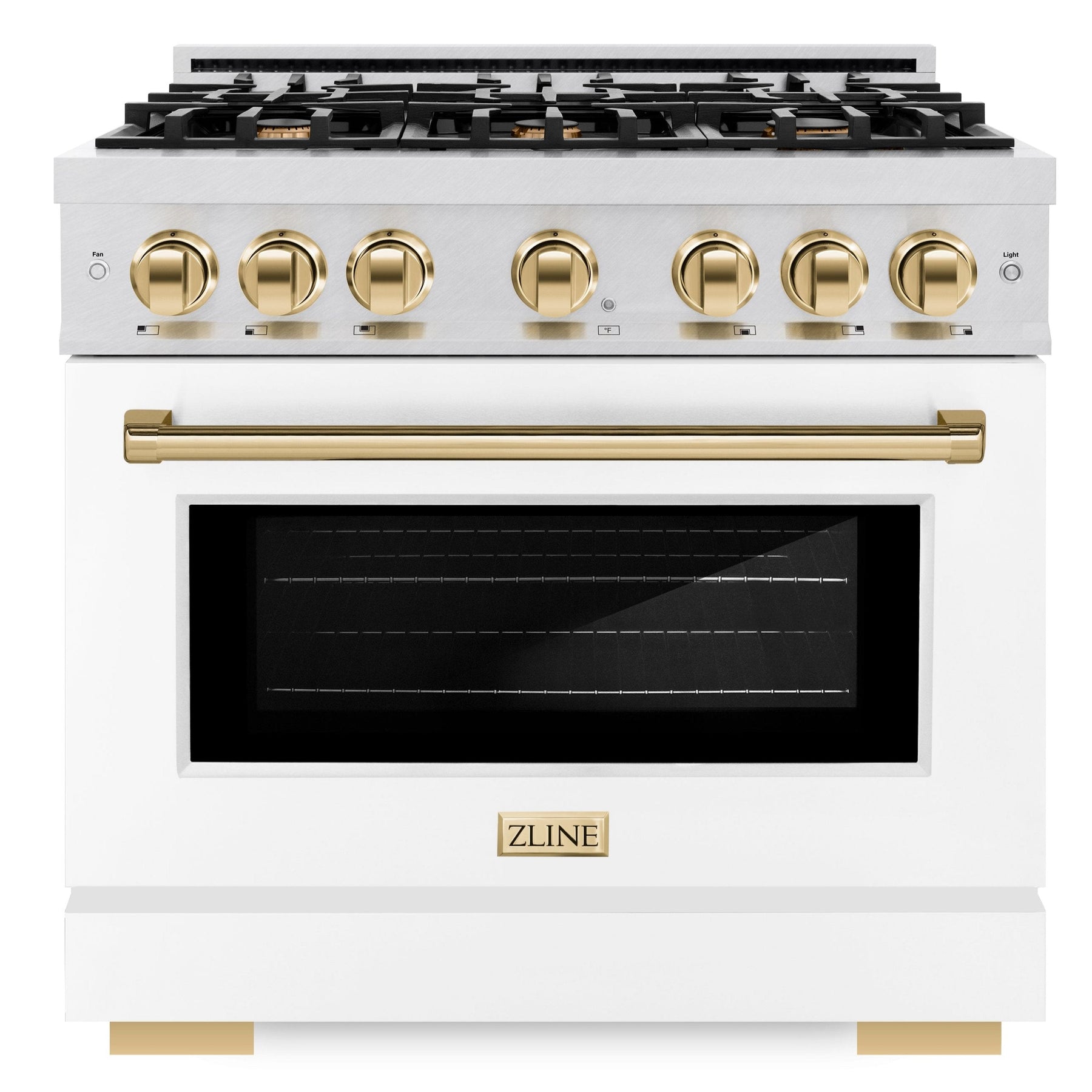 The ZLINE Autograph Edition 36" 5.2 cu. ft. Select Gas Range with 6 Burner Cooktop and Convection Gas Oven in DuraSnow Stainless Steel with White Matte Door and Polished Gold Accents (HGRSZ-WM-36-G) combines the elegance of a hand-finished porcelain gas cooktop with 6 Italian-made auto-reignition burners, a gas convection oven with an energy-efficient cooling fan to ensure quiet operation, a beautiful white matte door with a Horizon window design, and stunning polished gold knobs and handle allowing you to master every meal. With a modern, timeless style and refined functionality, ZLINE Select Gas Ranges are masterfully crafted to deliver an elevated culinary experience.