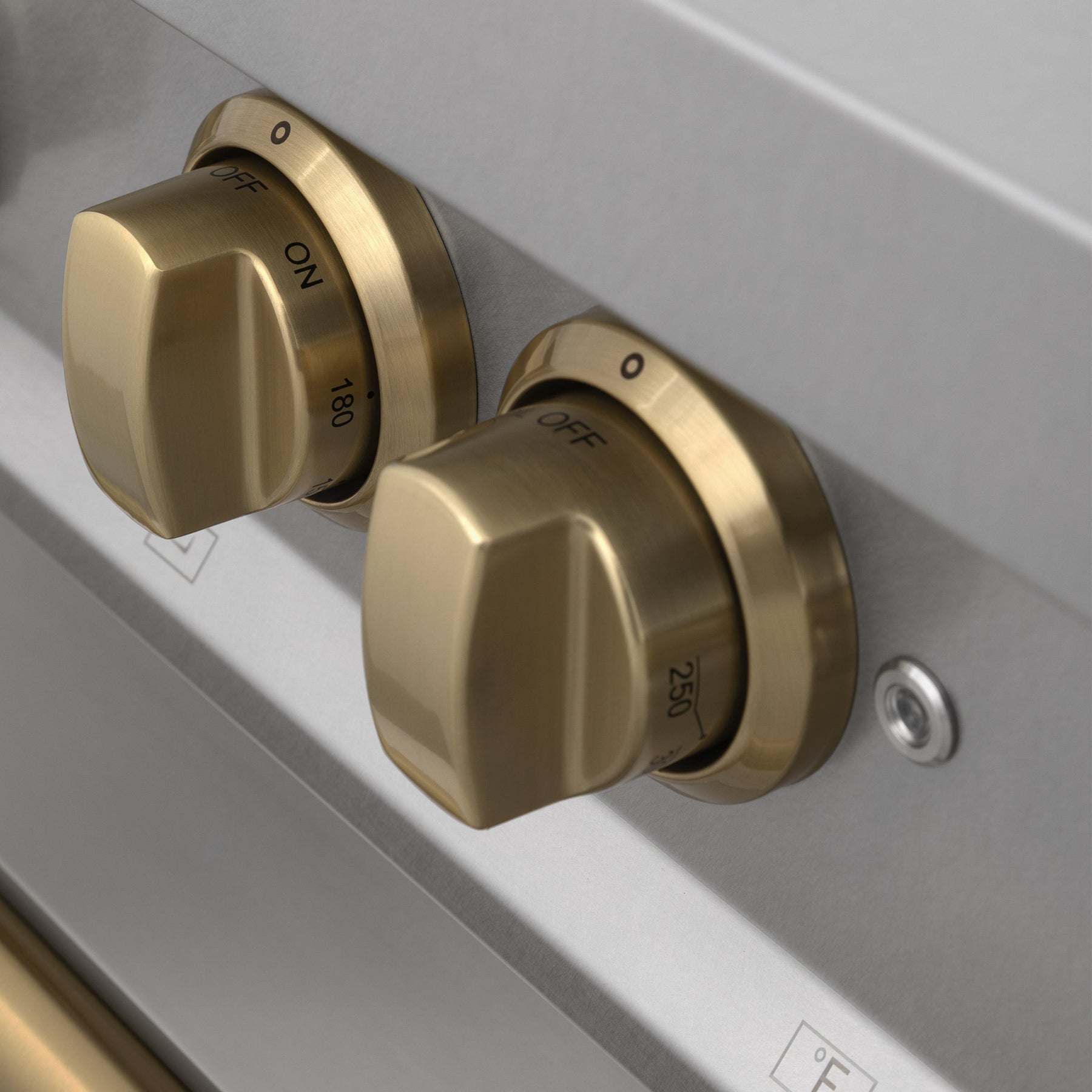 - Create a custom kitchen with easy installation - this Autograph Edition range is pre-assembled and shipped out complete with champagne bronze knobs, handles, legs, and brass burners.
