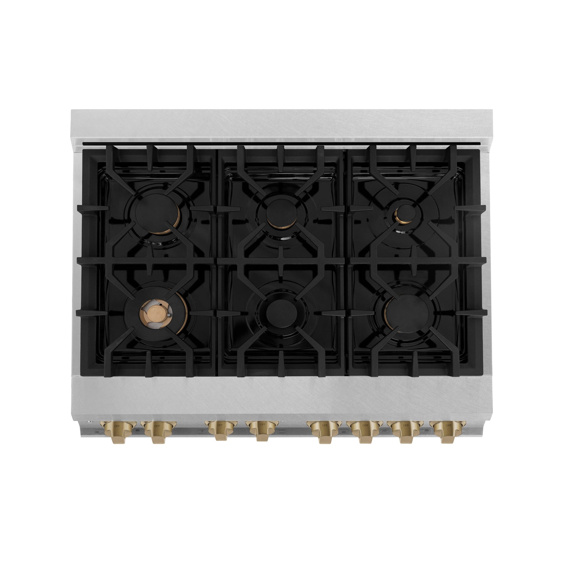 - ZLINE's Italian brass burners give this range an elevated, timeless pop of color while providing enhanced cooking benefits such as superior heat retention and even flame distribution.