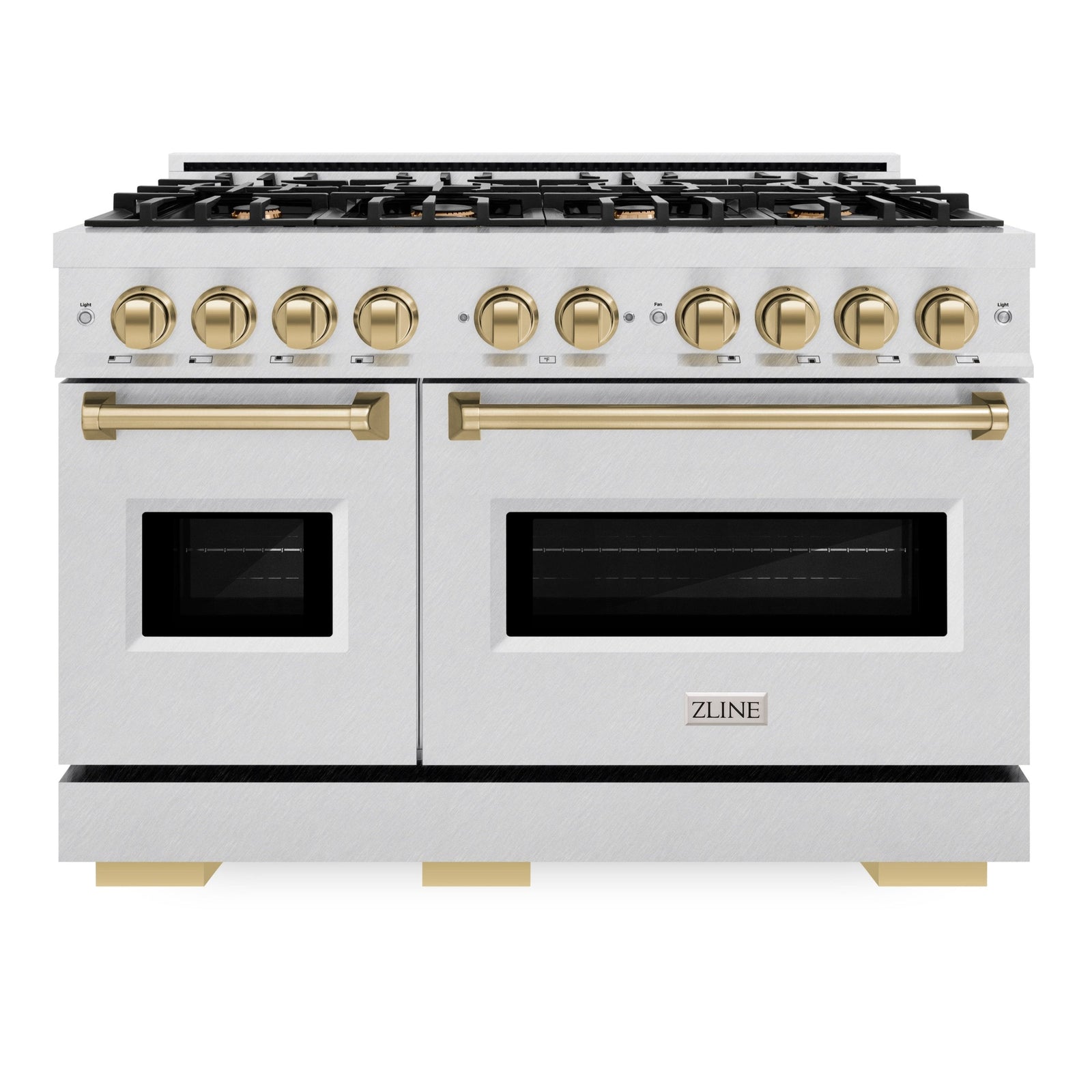 The ZLINE Autograph Edition 48" 6.7 cu. ft. Classic Double Oven Gas Range with 8 Burner Cooktop in DuraSnow Stainless Steel and Champagne Bronze Accents (CGRSZ-48-CB) combines the elegance of a hand-finished porcelain gas cooktop with 8 Italian-made auto-reignition burners, a large gas convection oven with an energy-efficient cooling fan to ensure quiet operation, a small baking oven, Landscape oven door window designs, and stunning champagne bronze knobs and handles allowing you to master every meal. With a modern, timeless style and refined functionality, ZLINE Classic Gas Ranges are masterfully crafted to deliver an elevated culinary experience.