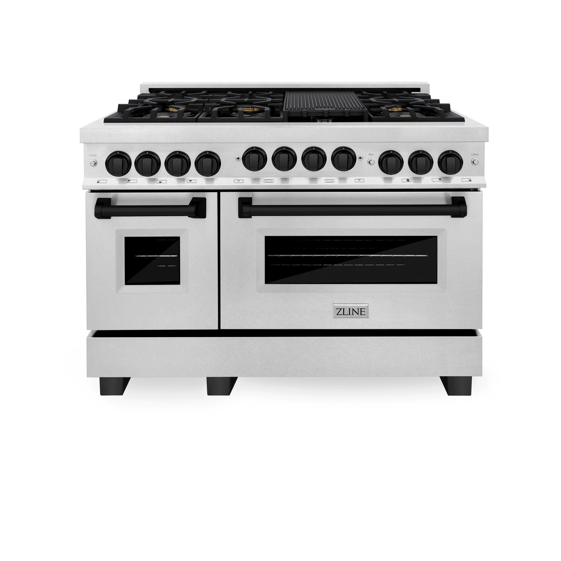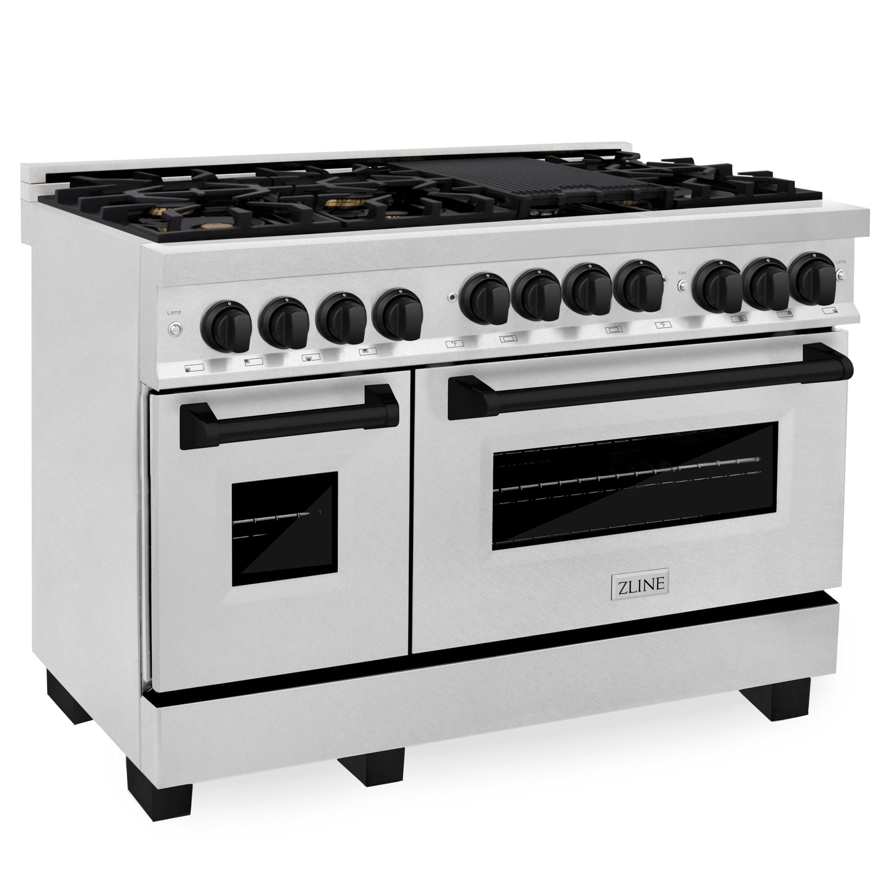 This ZLINE Kitchen Autograph Appliance Package has a powerful DuraSnow® stainless steel 48" Gas Range and 48" Range Hood - all with eye-popping Matte Black Accents!