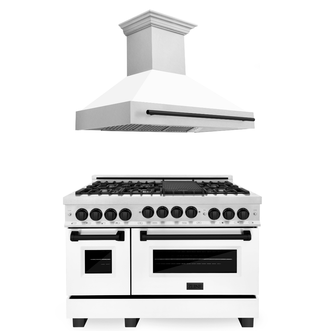 This ZLINE Kitchen Autograph Appliance Package has a powerful DuraSnow® stainless steel 48" Gas Range and 48" Range Hood - all with eye-popping Matte Black Accents!