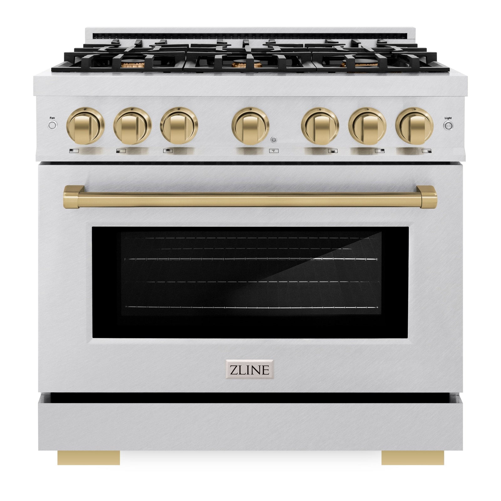ZLINE Autograph Edition 36" 5.2 cu. ft. Classic Gas Range with 6 Burners in DuraSnow® Stainless Steel and Polished Gold Accents, CGRSZ-36-G