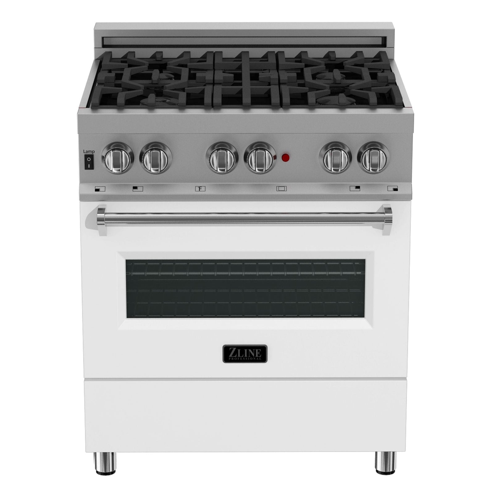 ZLINE Kitchen and Bath 30 in. Dual Fuel Range in DuraSnow® with White Matte Door & 30 in. Range Hood Appliance Package, 2KP-RASWMRH30
